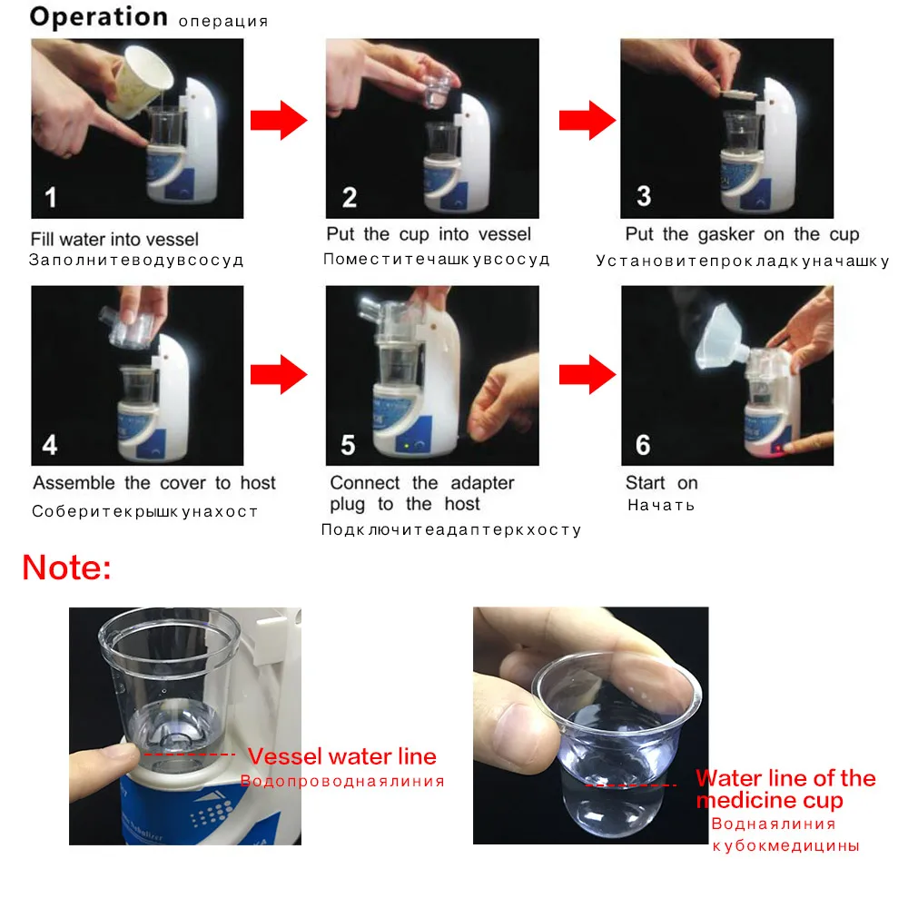 1 х портативный распылитель2 маски (1 взрослый размер и 1 детский размер)5 медицинских стаканчиков2 части рта1 х Портативный Небулайзер с вилкой переменного тока (мощность: 110 В ~ 240 В (подходит для всей страны мира), мы предоставляем штепсельную вилку Великобритании/США/ЕС, вы можете выбрать его в соответствии с вариантами)1 х руководство на английском языке