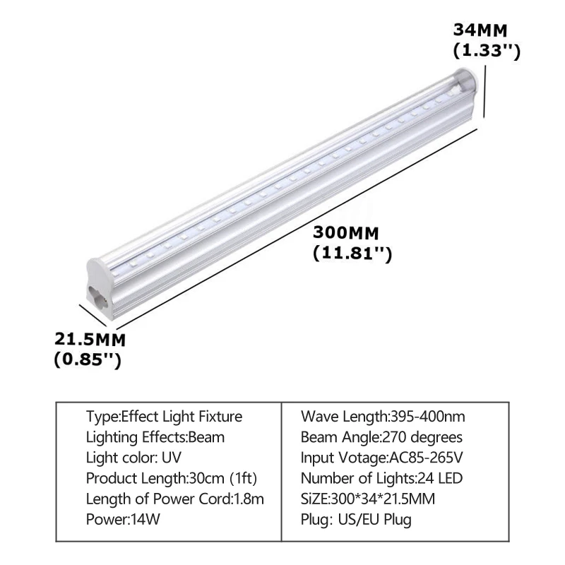 Материал: ПВХ + алюминий Световые эффекты: луч Светильник Цвет: УФ-защита Длина изделия: 32 см Длина из Мощность шнура: 1,8 м Мощность: 10 Вт Длина волны: 395-405нм Угол луча 180 градусов Входная мощность: AC85-265V Количество ламп: 40 светодиодный Размер: 320*32,5*34,5 мм Вилка: вилка США/ЕС