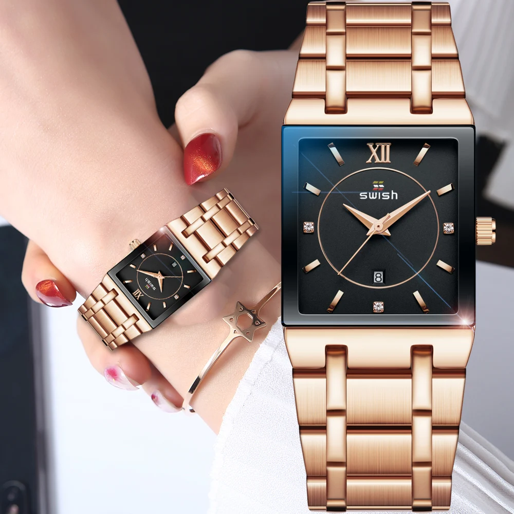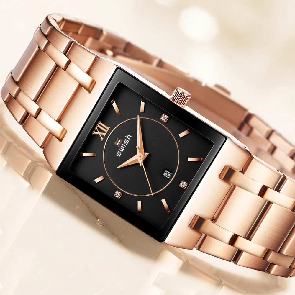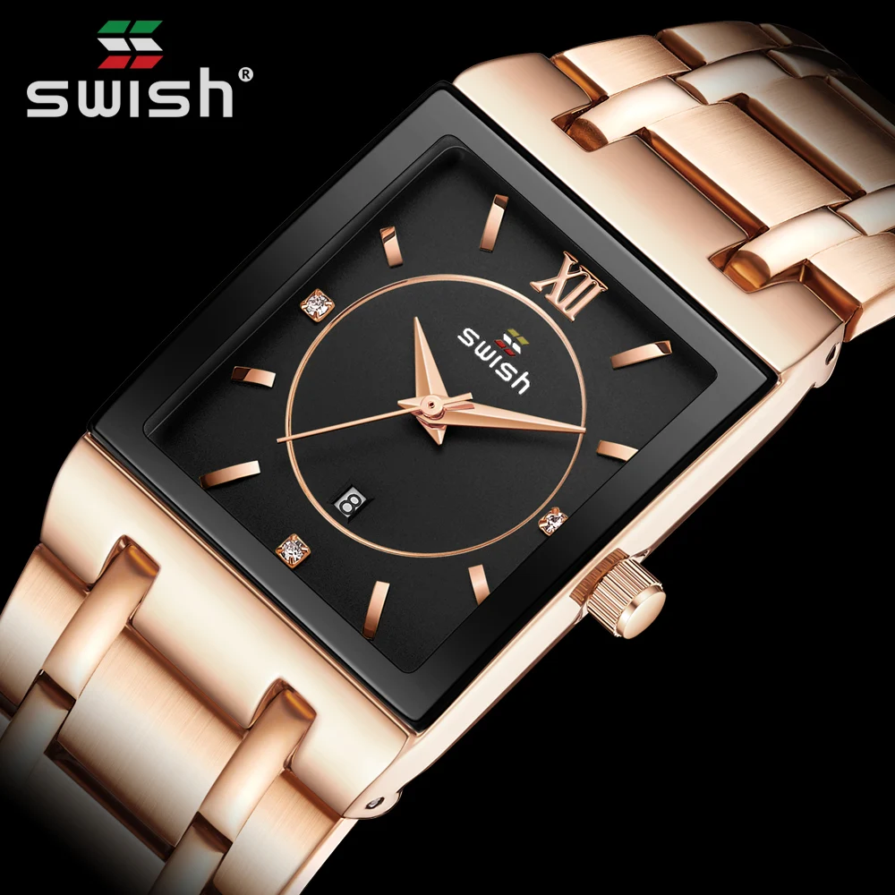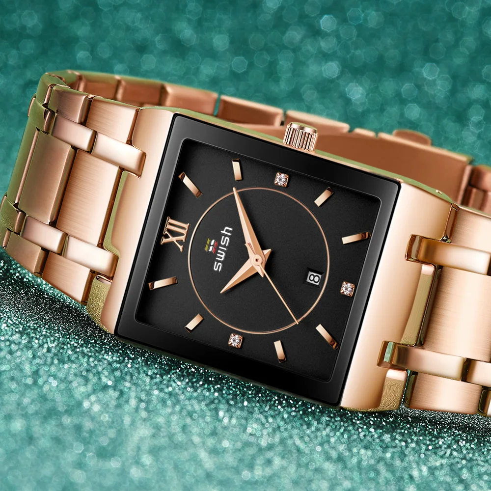 Часы наручные SWISH женские кварцевые, брендовые Роскошные Простые Модные деловые, с квадратным циферблатом, золотистые водонепроницаемые