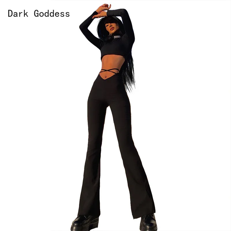 Женские пикантные облегающие леггинсы с высокой талией, черные брюки со шнуровкой, расклешенные брюки 2021, женские праздвечерние чные облегающие брюки с широкими штанинами