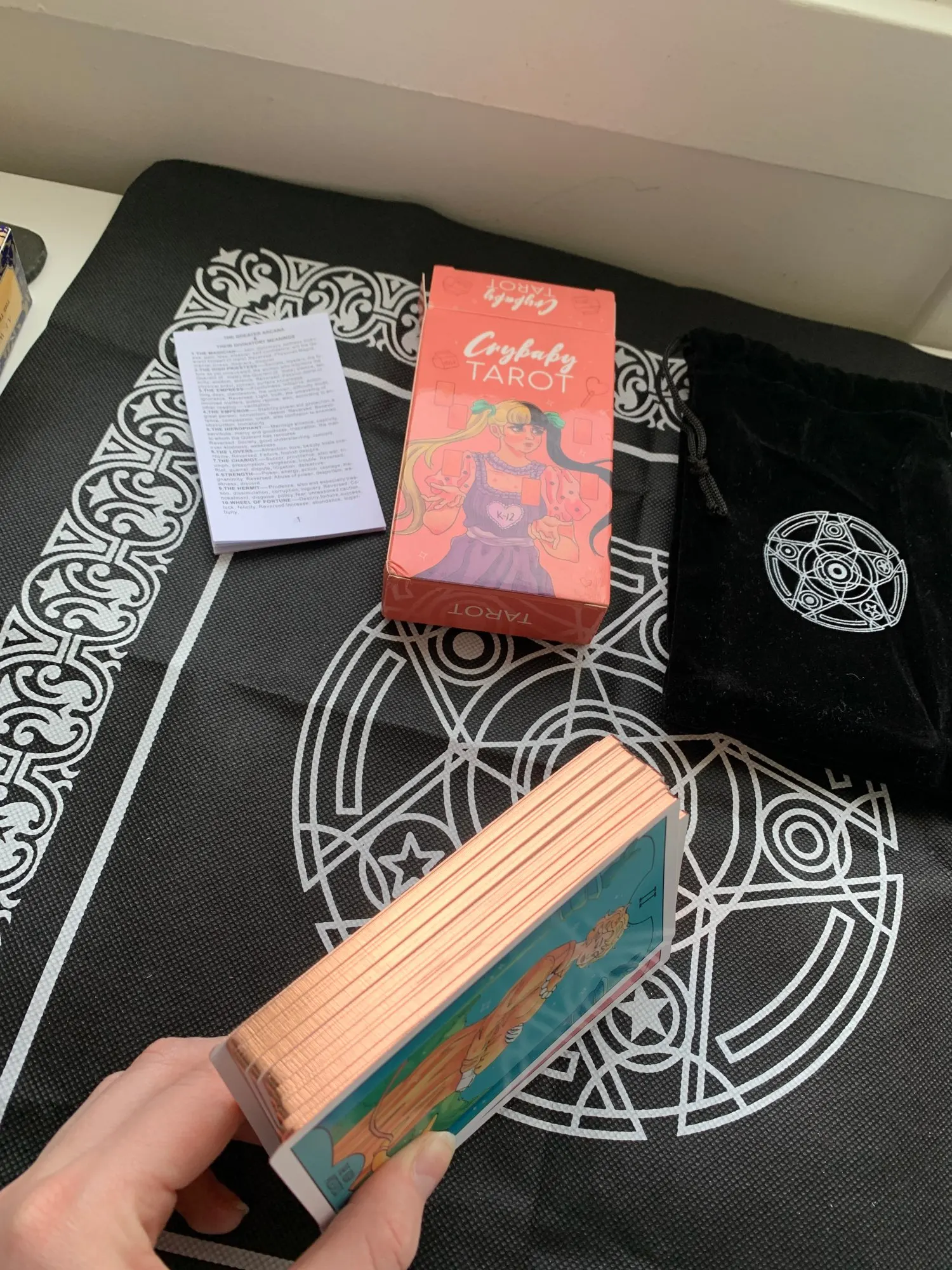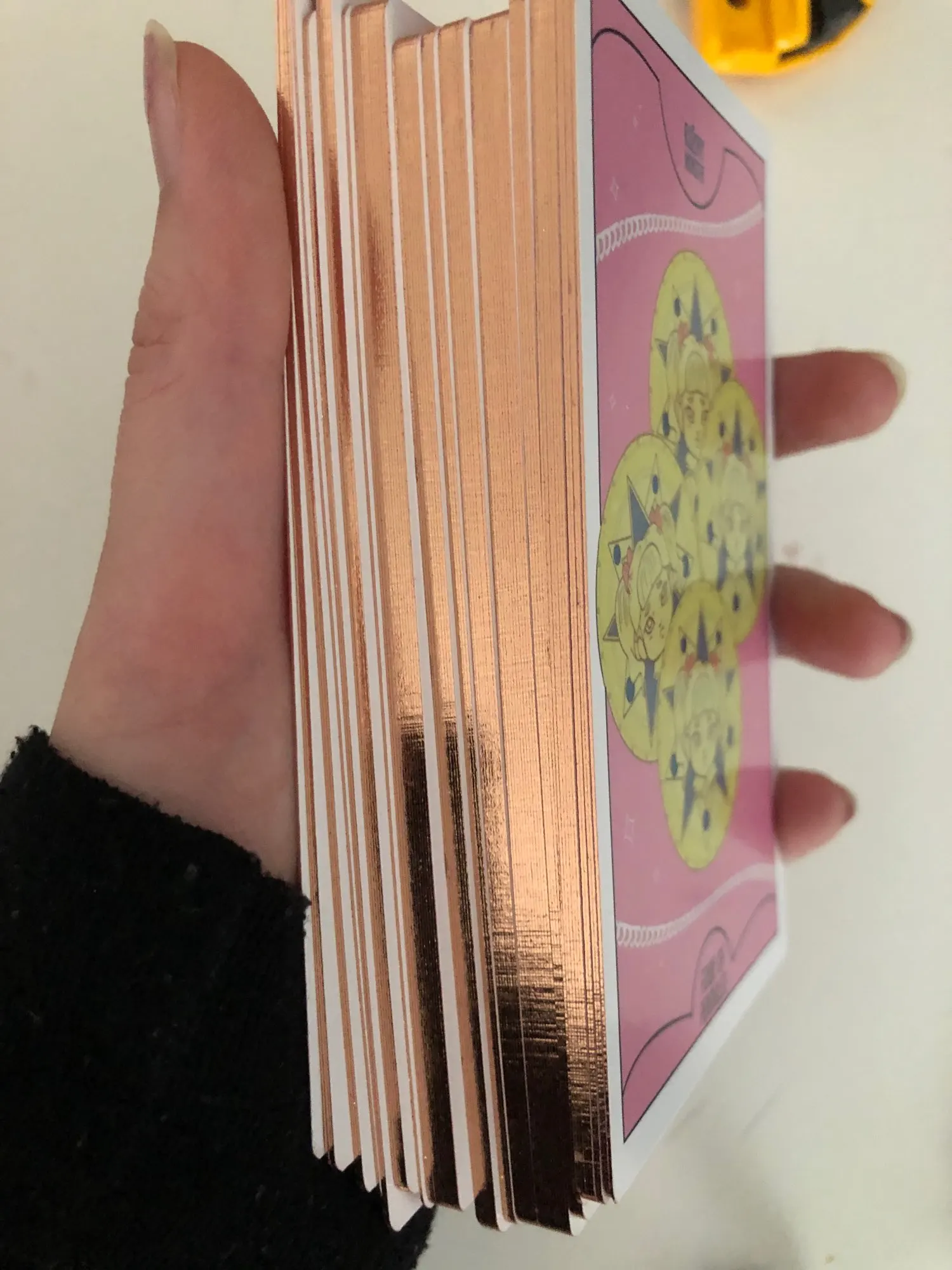 Товар поставляется с приятными неожиданными скидками. Края пришиты позолоченными розовыми золотыми блестками, и карты поставляются в черном бархатном мешочке. Блеск немного переходит на руки, но эффект настолько красивый, что мне лично все равно. Некоторые изображения были немного размыты, но все равно отлично подходят для цены. Доставка была медленной. Все еще очень доволен!