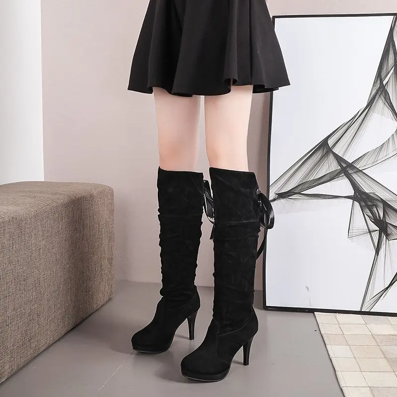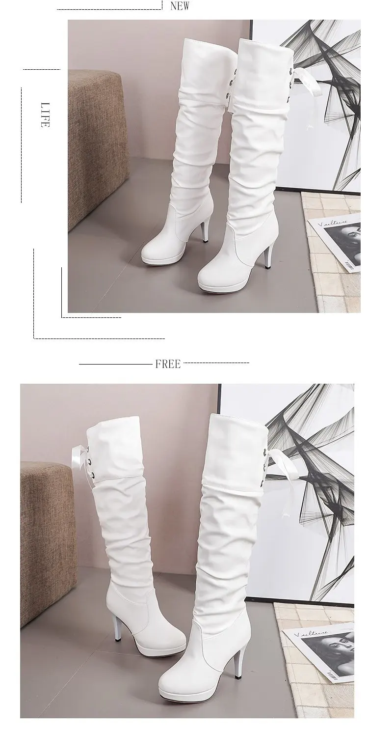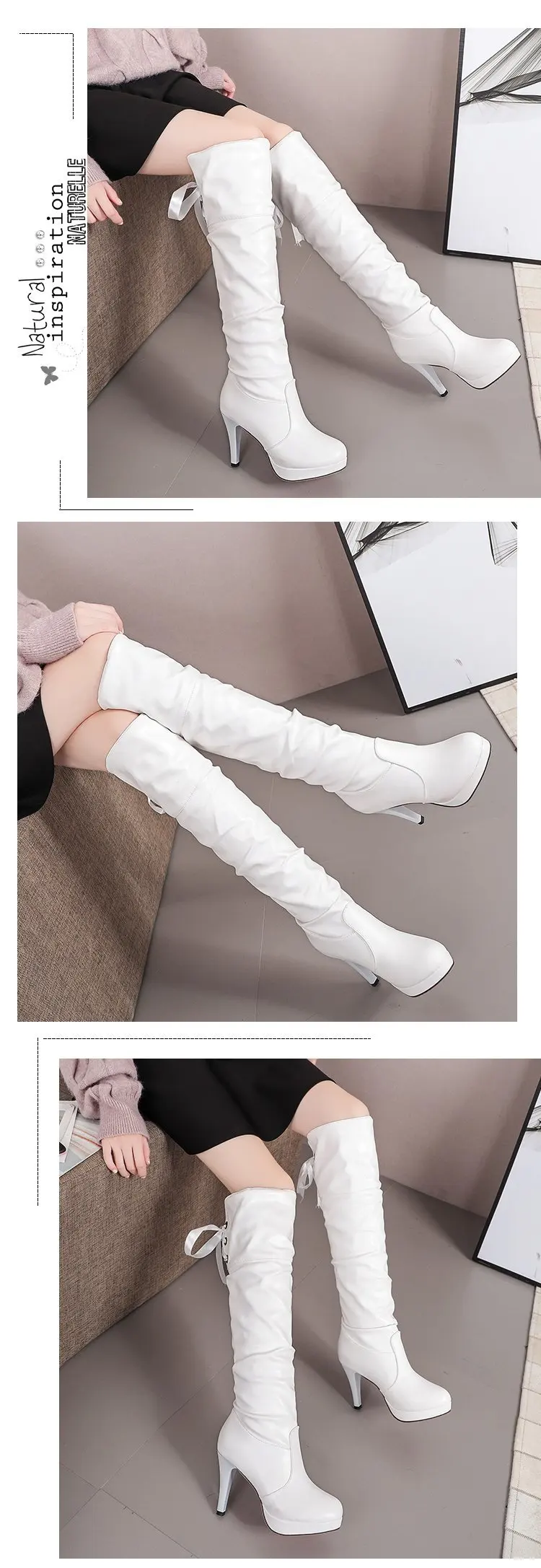 Женские облегающие привлекательные Сапоги выше колена, модные зимние черные, белые сапоги с кружевом и лентой на тонком высоком каблуке 2021 см, высокие сапоги до бедра, 9,5
