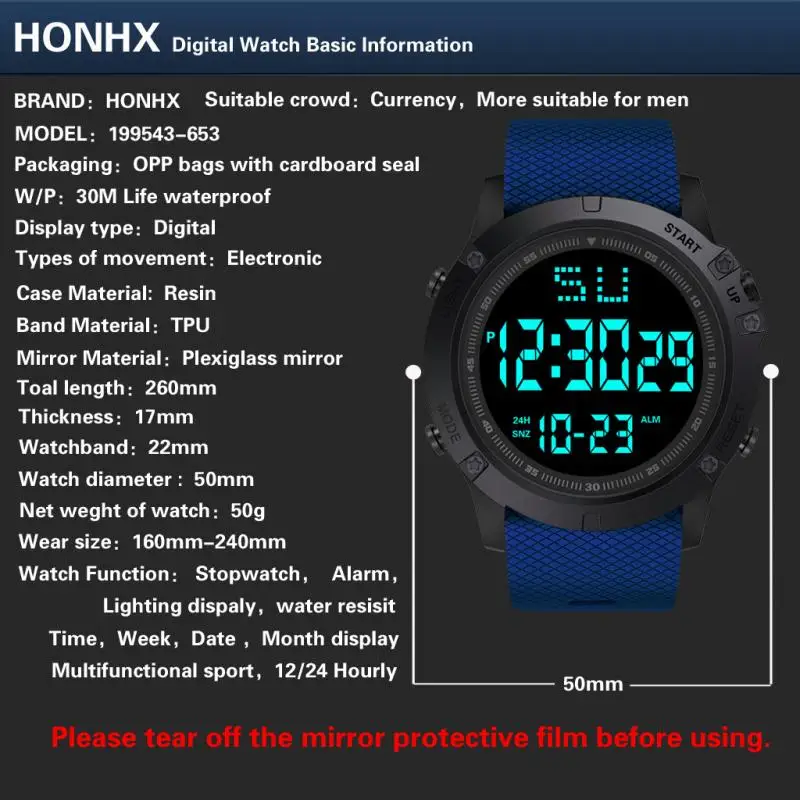 Электронные часы HONHX, Водонепроницаемые многофункциональные светодиодные цифровые часы с большим черным экраном и секундомером, часы с будильником и датой, спортивные наручные часы