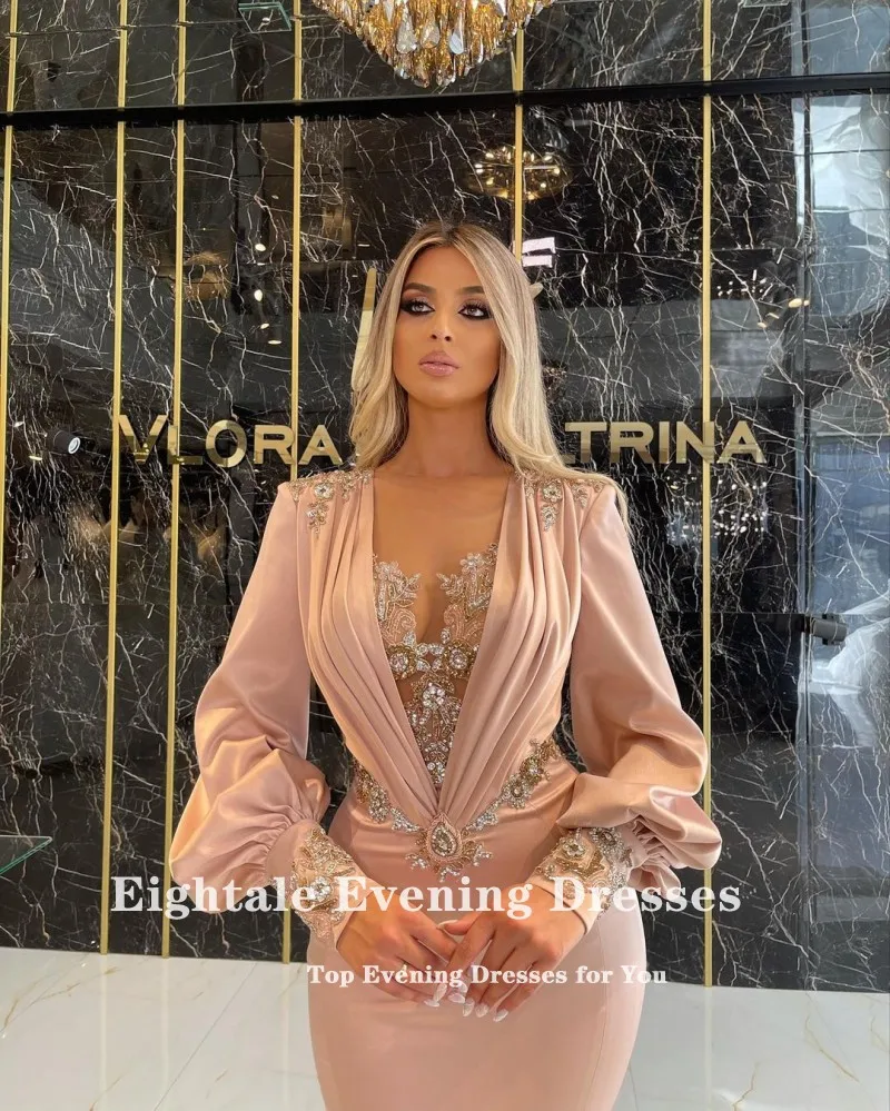 Платье вечернее атласное с бусинами, длинными рукавами-фонариками