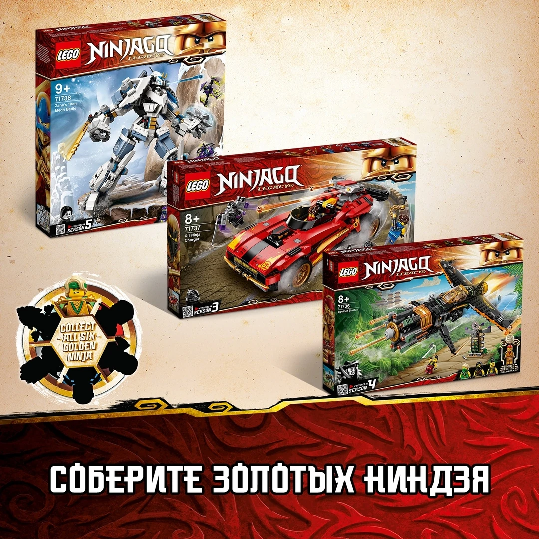 Ищите остальные особые коллекционные золотые минифигурки в других наборах NINJAGO®: «Скорострельный истребитель» (71736), «Ниндзя-перехватчик Х-1» (71737) и «Битва с титаном Зейна» (71738).