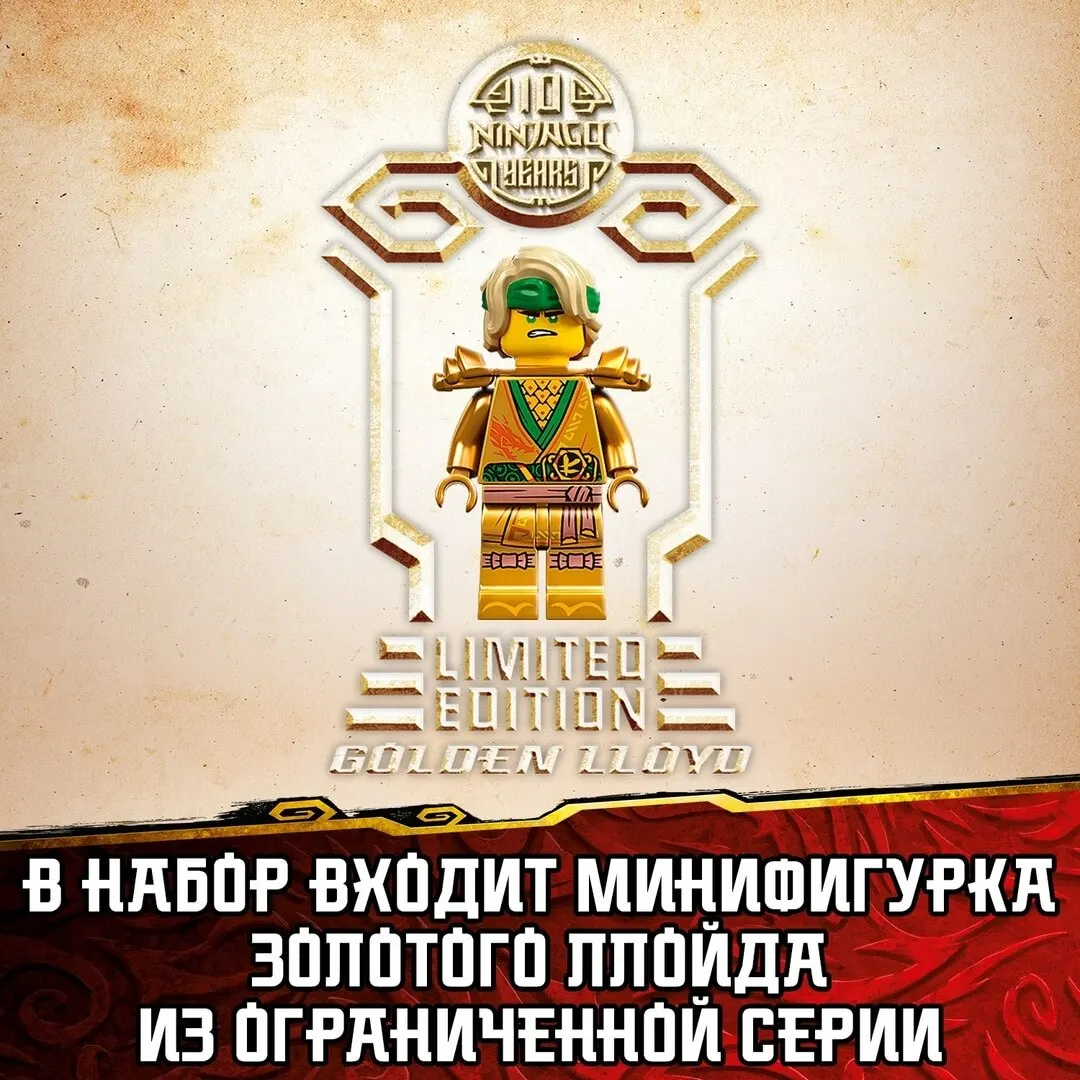 Включает коллекционную золотую минифигурку «Наследие Ллойда» на небольшой подставке в честь десятилетнего юбилея игрушек NINJAGO®.