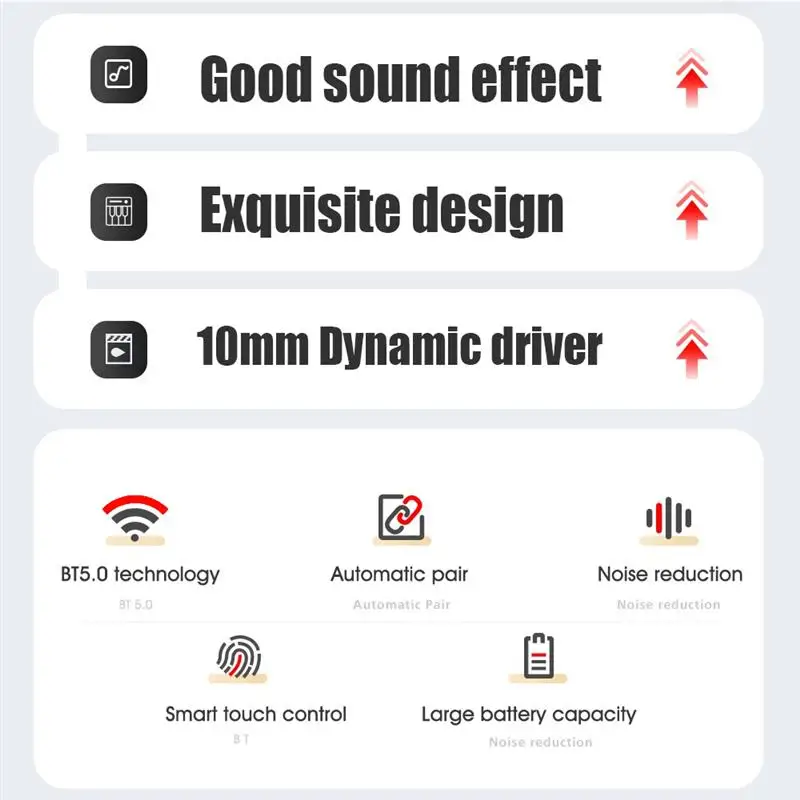 Описание: Новое решение Bluetooth V5.0 имеет более высокую производительность обработки, более быстрое соединение и стабильную стабильность, а также сверхнизкую задержку. Левый и правый наушники имеют двухканальную передачу, мастер и раб могут быть переключены по желанию, и одиночный и двойной режим уха может быть использован все, что вы хотите, что приносит различный истинный беспроводной опыт. Bluetooth-чип нового поколения V5.0 поддерживает бинауральные звонки высокой четкости, гарантируя, что ваш голос будет доставлен другим ушам partys в высокой четкости, и каждое общение будет чистым. Профессиональная трехчастотная регулировка, сильная и Шокирующая низкая частота, чистый промежуточный уровень частоты, яркая и деликатная высокая частота, принесет вам полный и трехмерный слуховой аппарат на месте. Его можно заряжать в любое время и путешествовать с душевным спокойствием. Музыка всегда с вами. Характеристики: Форма: неправильная Цвет: черный/белый/розовый Вес брутто: 120 г Размер упаковки: 10*12*3 см Версия Bluetooth: 5,0 Мощность: 3 мВт Емкость аккумулятора для наушников: 40 мАч Время работы в режиме разговора: 3-5 часов Водонепроницаемость: IPX5 Радиус передачи: 10 м Примечание: -Возможны небольшие погрешности в размере при ручном измерении. -Отклонение цвета может отличаться из-за различных настроек монитора, пожалуйста, поймите.
