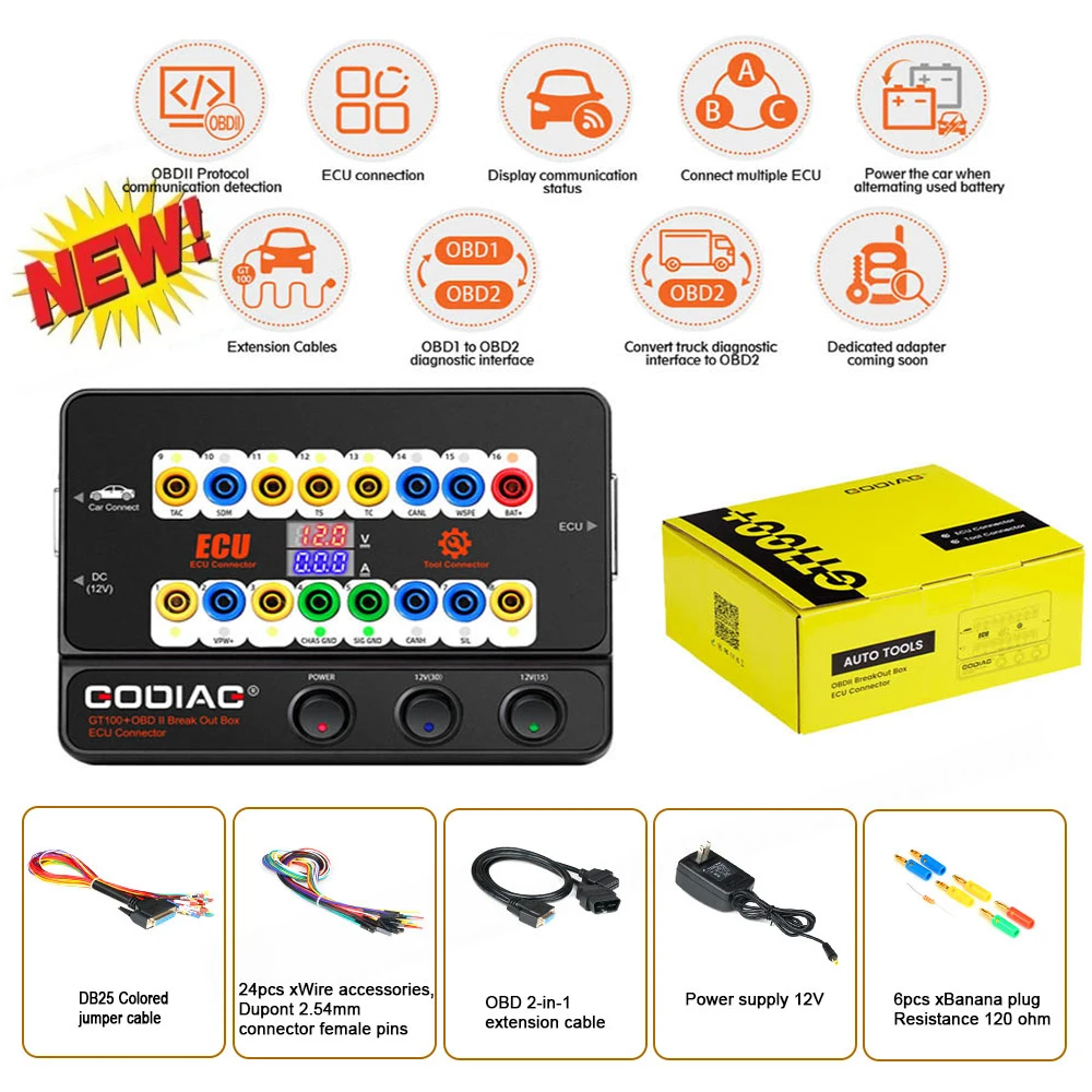 GODIAG GT100 + новое поколение OBDII коммутационная коробка с электронным дисплеем тока