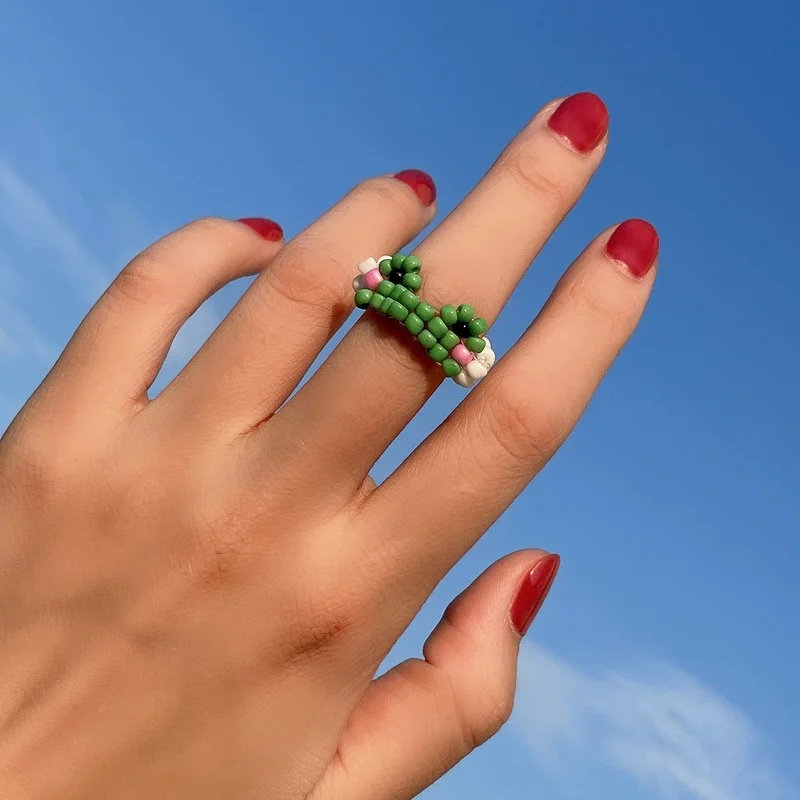 Кольцо женское, плетеное, с лягушкой, 2021, в богемном стиле, разноцветное, украшенное бисером, бусины в виде риса
