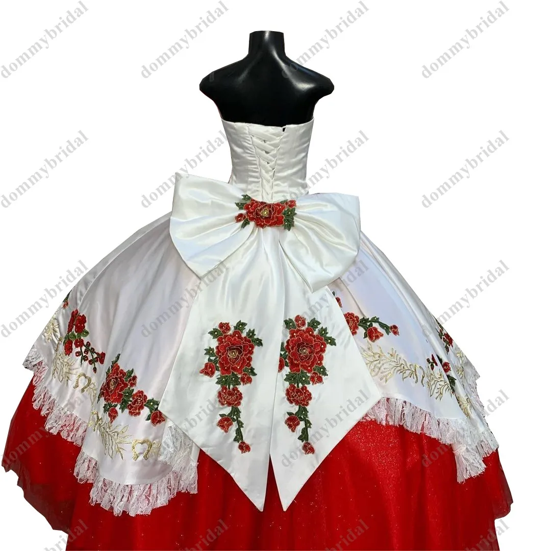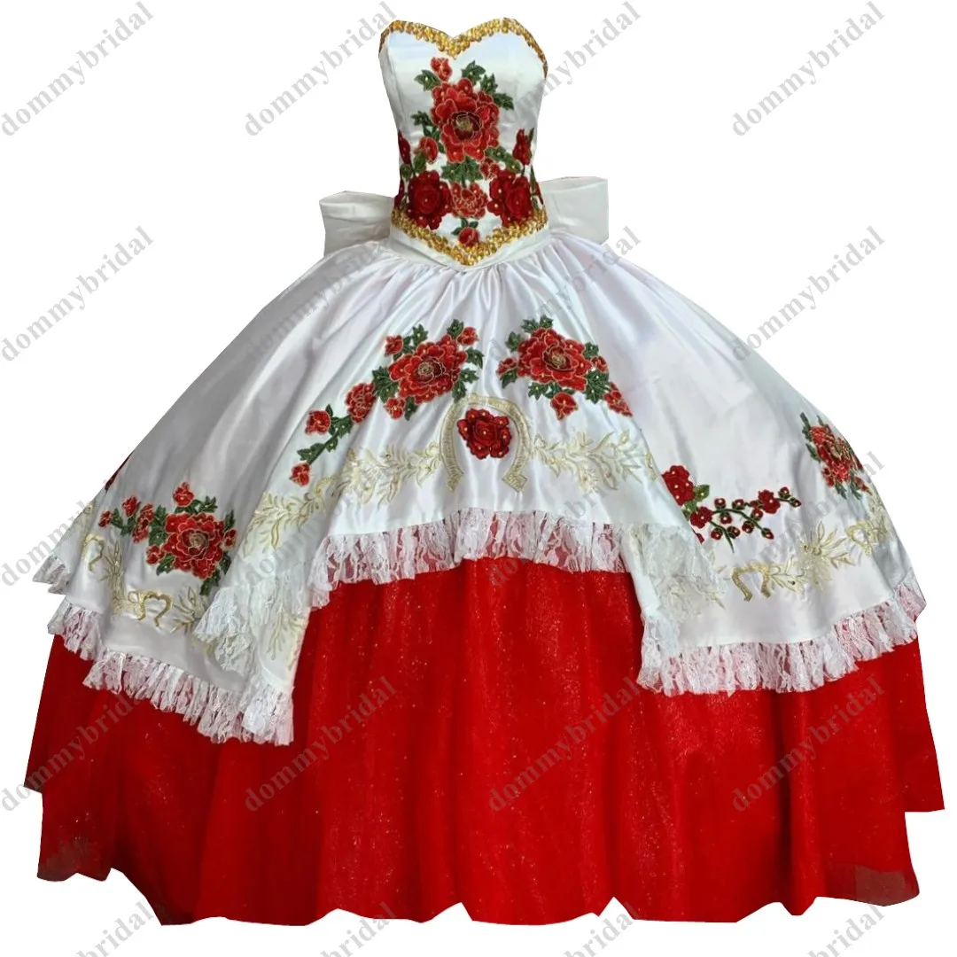 2022 скромное красно-Белое Бальное Платье, мексиканское шарro Quinceanera, платья с золотой вышивкой, большие банты, цветочные кружева XV по низкой цене