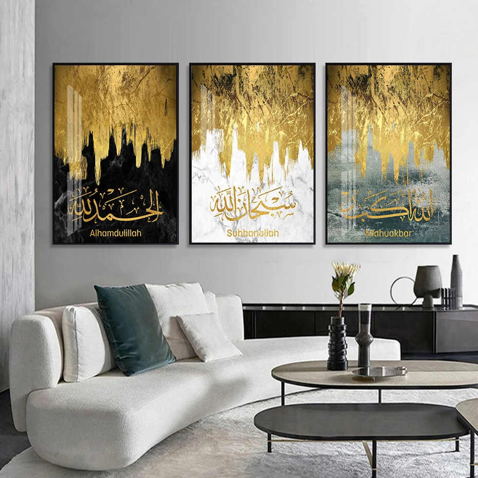Мусульманская каллиграфия Allahu Akbar, Золотые Мраморные современные плакаты, Картина на холсте, Настенная картина, картины для гостиной, домашний декор