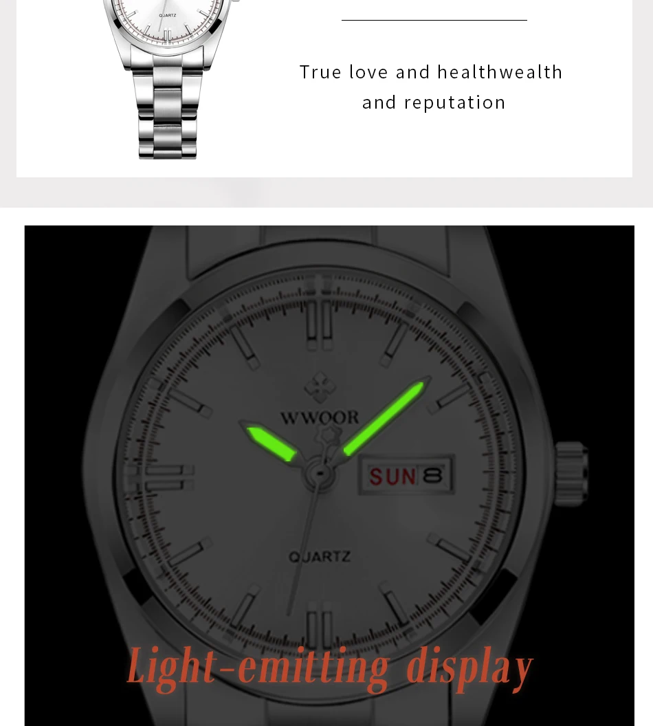 -Оригинальные Брендовые Часы WWOOR, хорошие подарки для родственников и друзей.-Повседневный, подходит на все случаи жизни.-Стильный и романтические наручные часы-И хорошо провести времяТехнические характеристики (приблизительно):-Диаметр корпуса: 29,0 мм-Толщина корпуса: 9,8 мм-Ширина полосы: 16 мм-Общая длина: 210 мм-Вес изделия: 68 гПосылка-1 часы WWOOR-1 х бирка WWOOR/игла для регулировки ремешка-1 x WWOOR box (необходимо выбрать Артикул с коробкой)>>> Уважаемый клиент, мы поддерживаем оптовые и прямые продажи