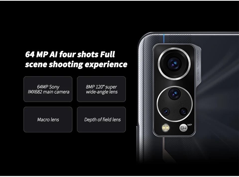 Вне зависимости от того, исследуете ли вы новые места или просто остаетесь с друзьями, камера Axon 30 5G quad идеально подходит для любого случая.Основная камера 64 мпШирокоугольная камера 8 МП (120 °)Глубина камеры 5 МпКамера с макрообъективом 2 МП