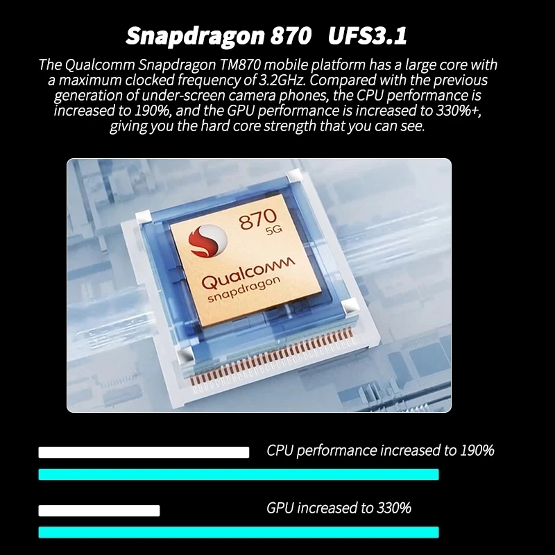 1. Процессор ------ Восьмиядерный Snapdragon 8702. Экран ------ 6,92 дюймов, частота обновления 120 Гц, OLED, поддержка 100% DCI-P3, с 1,07 млрд цветов3. Камера ------ фронтальная камера: 16 МП селфи камераЗадняя камера: Основная камера 50 Мп + Ультра широкоугольный фотоаппарат 8 Мп + Глубина поля 5 Мп + макрокамера 2 МП4. Система ------ глобальная версия5. Аккумулятор ------ 4200 мАч (несъемный),65 Вт SuperCharge6. Поддержка нескольких языков ----- да7. Google Play Store ------ да Поддержка8. Обновление OTA ------ да Поддержка9. Поддержка NFC ------ да10. Сеть ------5G: n1/n3/n28/n41/n784G: TD-LTE / LTE-FDD3G: WCDMA:2G: GSM:* Подключение к сети может варьироваться в зависимости от несущей сети и реализации соответствующего сервиса