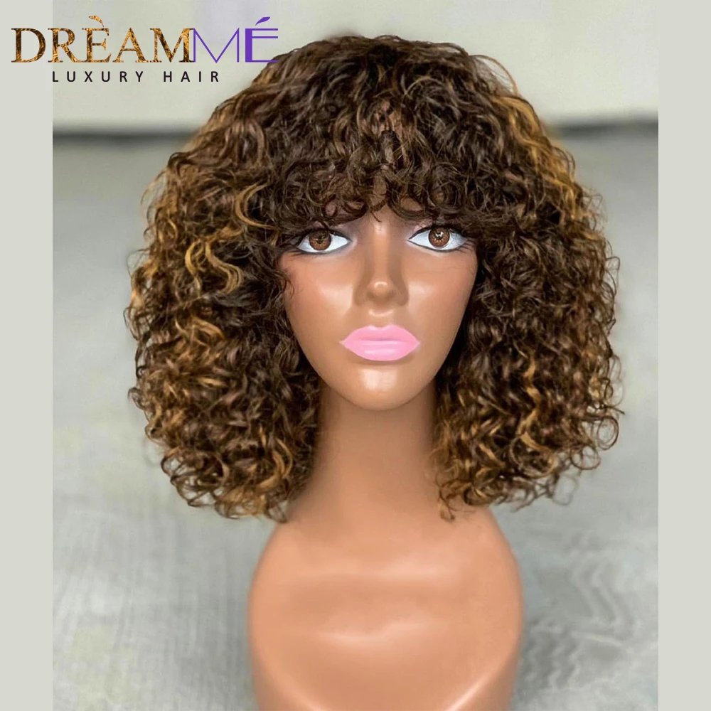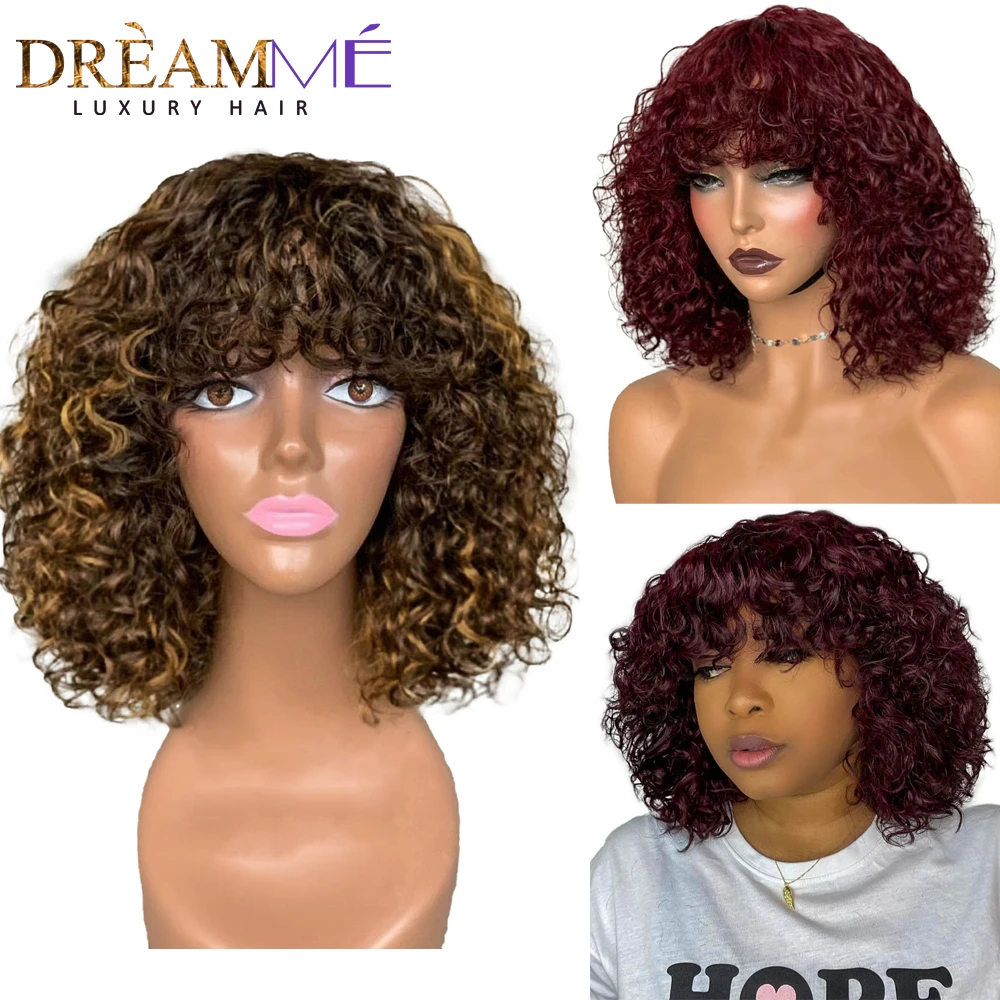 Короткие кудрявые парики из натуральных волос с челкой, блонд, полный машинный парик, волна воды 99J, бразильские волосы Remy
