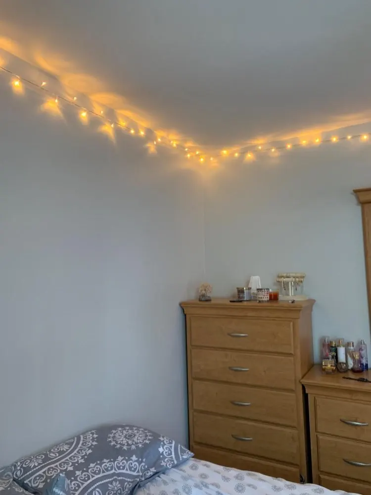 Так мило! Собрал мою комнату вместе. Отличное соотношение цены и качества. Я бы хотел купить более длинный комплект, потому что он не обошелся со всеми четырьмя стенками, всего 3 .. Но это нормально. Просто знайте, что около 5 футов провода не имеет освещения.