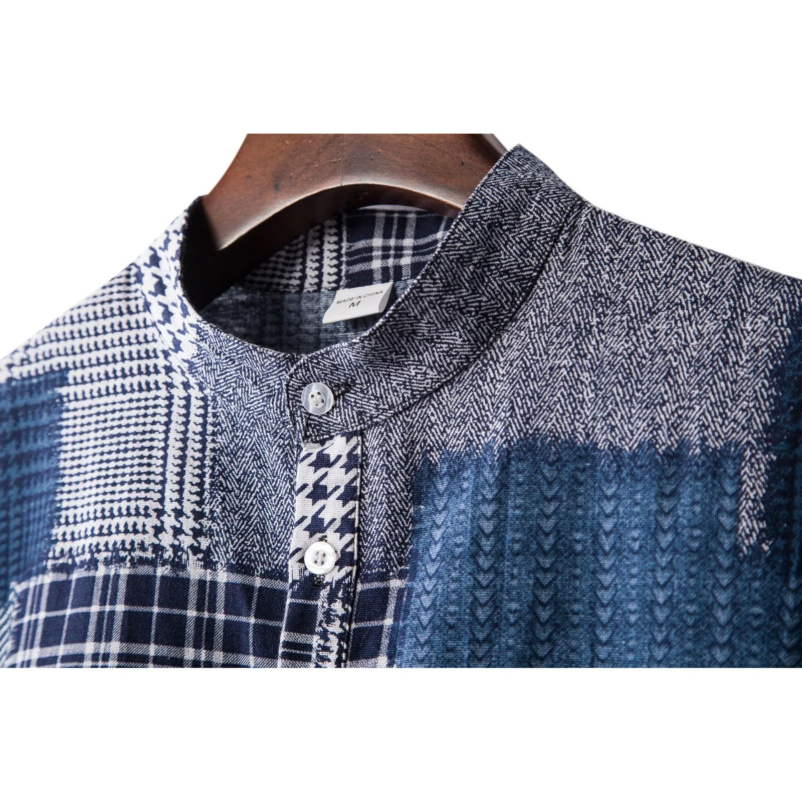 Рубашка мужская с короткими рукавами, модная Повседневная блузка из хлопка и льна в клетку, с воротником-стойкой, гавайская одежда, в винтажном стиле