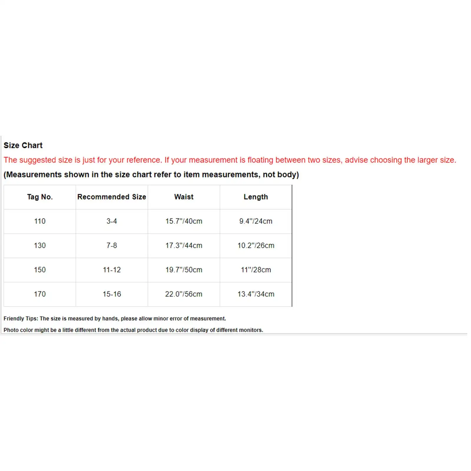 Номер бирки Рекомендуемый размер Талия Длина 110 3-4 15,7 ''/40 см 9,4 ''/24 см 130 7-8 17,3 ''/44 см 10,2 ''/26 см 150 11-12 19,7 ''/50 см 11 ''/28 см 170 15-16 22,0 ''/56 см 13,4 ''/34 смПолезные советы: Замеры делаются вручную, поэтому учитывайте небольшие погрешности.
