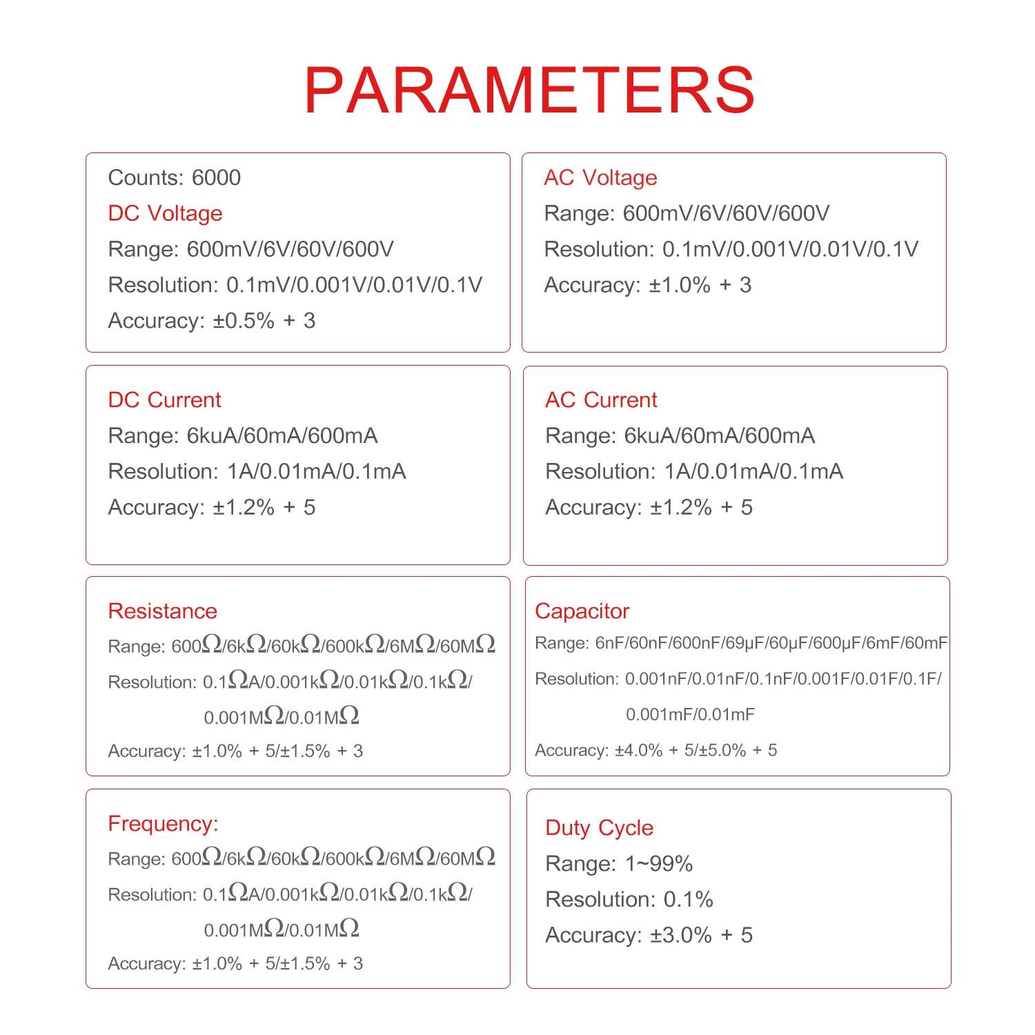Диапазон измерения ёмкости6nF/60nF/600nF/69μF/60μF/600μF/6mF/60mF