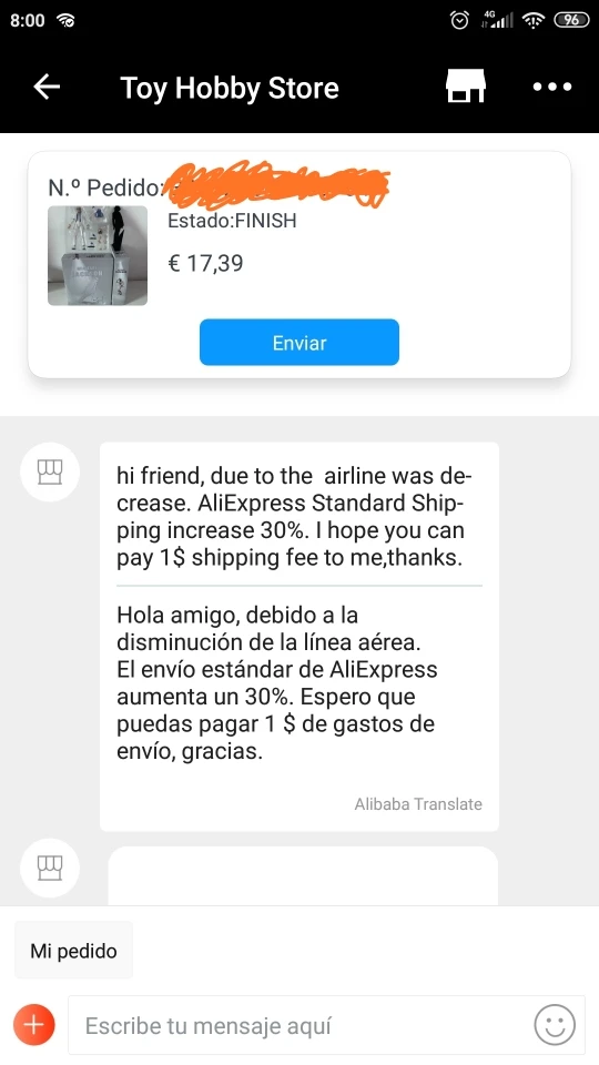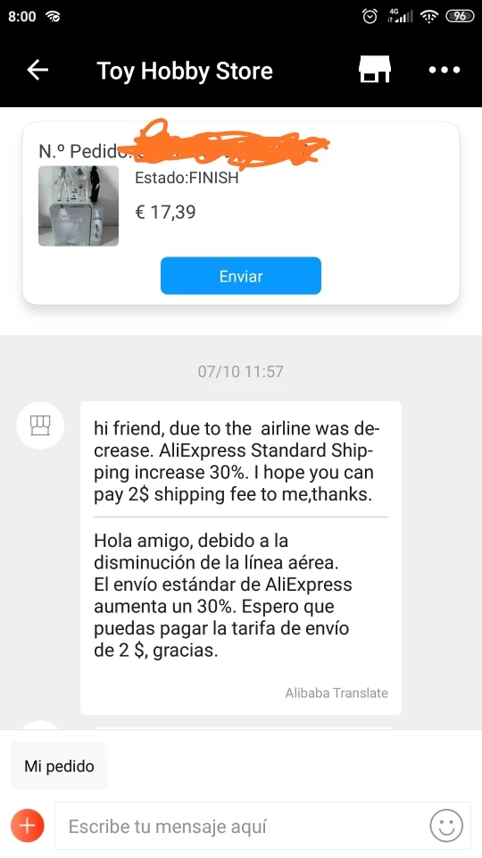 Говорит, что доставка за 10 дней, но он сохраняет заказ в ожидании отправки 12-14 дней, и вдобавок ко всему, он говорит вам, что если вы хотите, чтобы я отправил его раньше по причинам, по которым он не считается или его/он... что вы платите 1 € больше И через некоторое время, если вы не платите, он просит у вас еще 2 евро. Я прилагаю фотографии ваших сообщений. Коробка разобрана, чтобы она не ударила