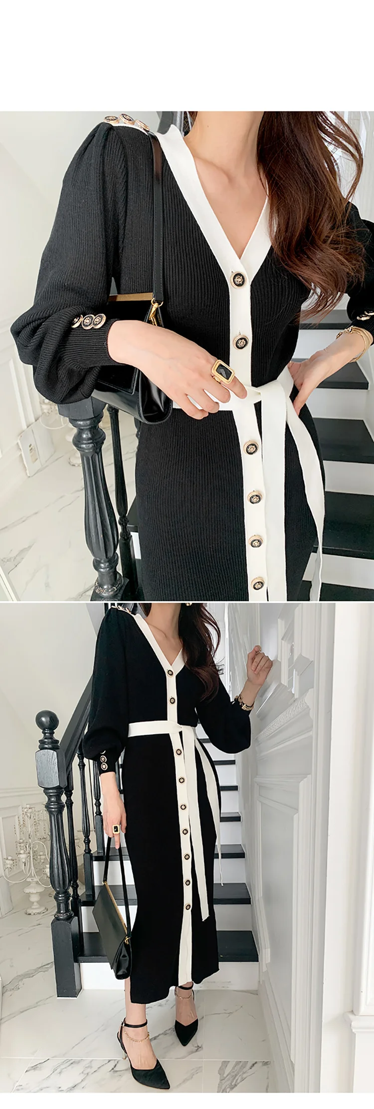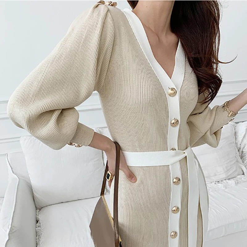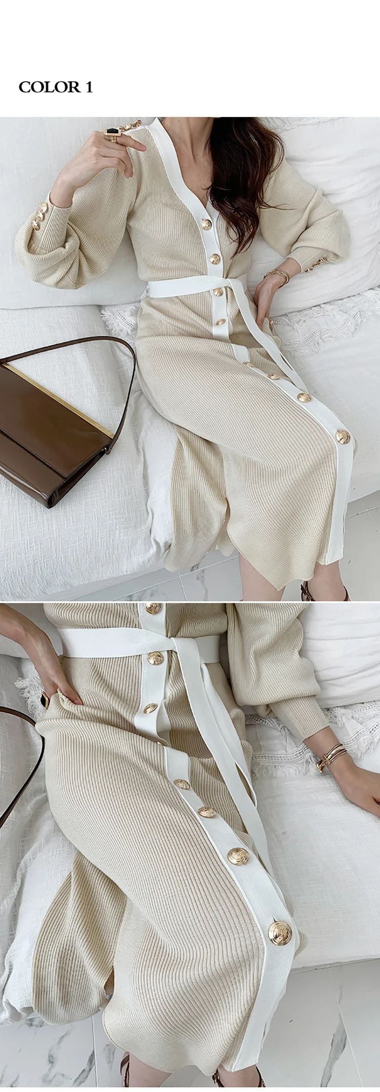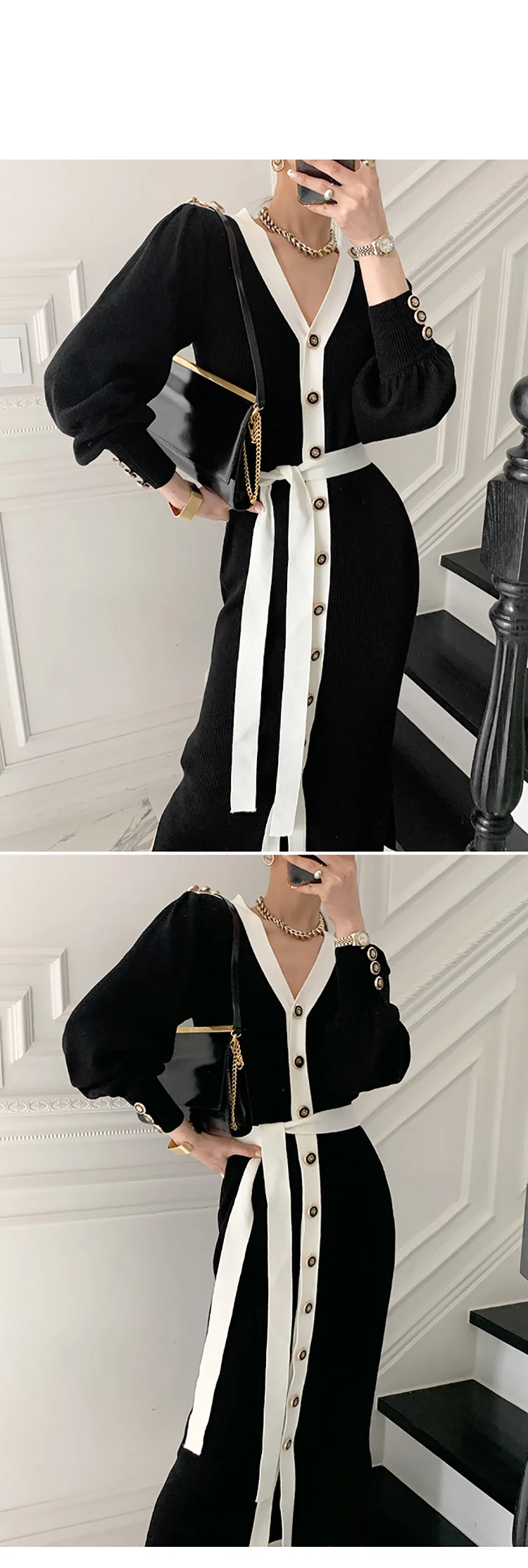 Осенне-зимнее женское длинное платье с V-образным вырезом, Элегантное однобортное вязаное платье с поясом и пышными рукавами, 3515 #