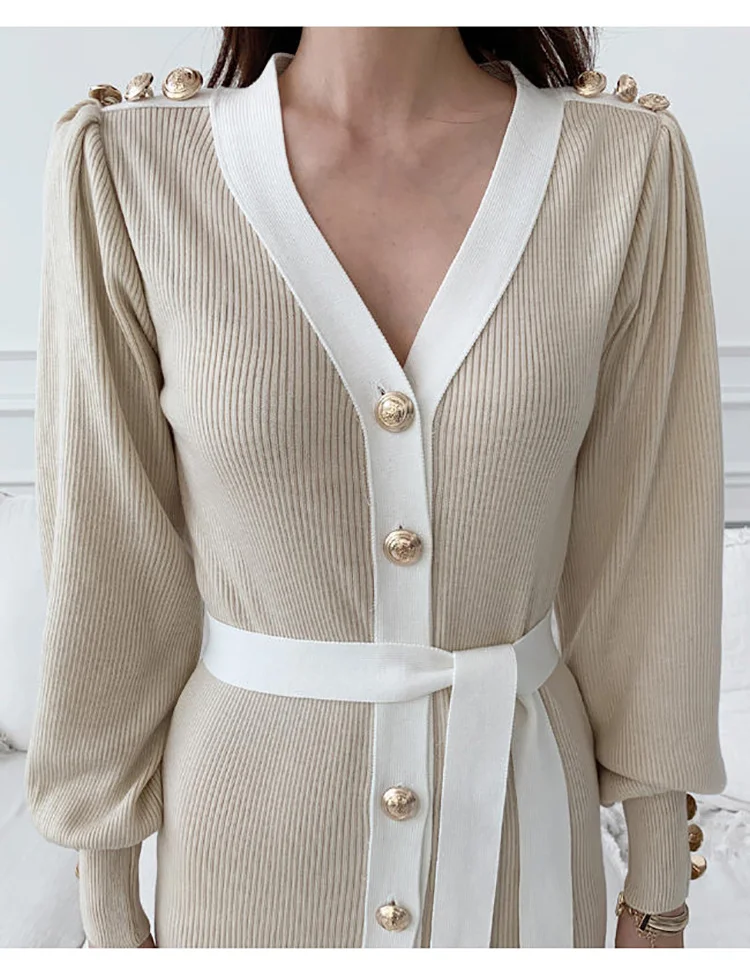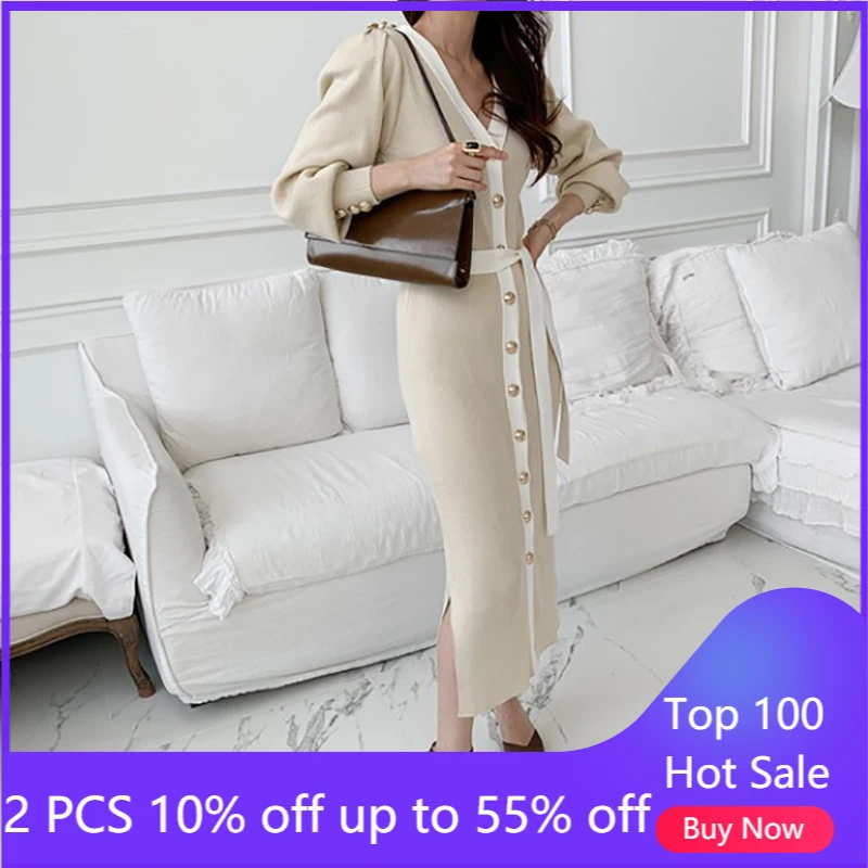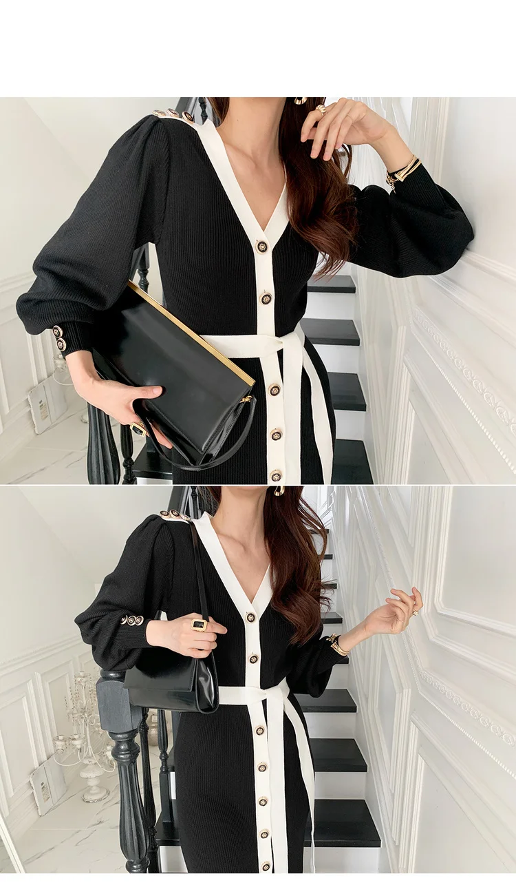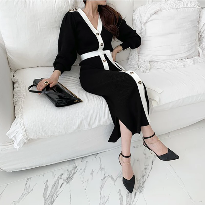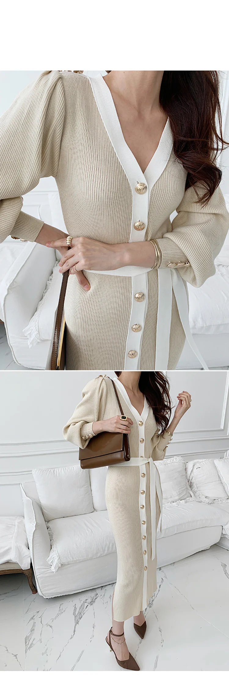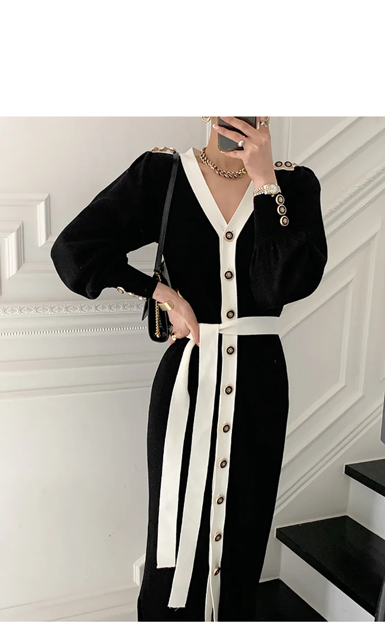 Осенне-зимнее женское длинное платье с V-образным вырезом, Элегантное однобортное вязаное платье с поясом и пышными рукавами, 3515 #