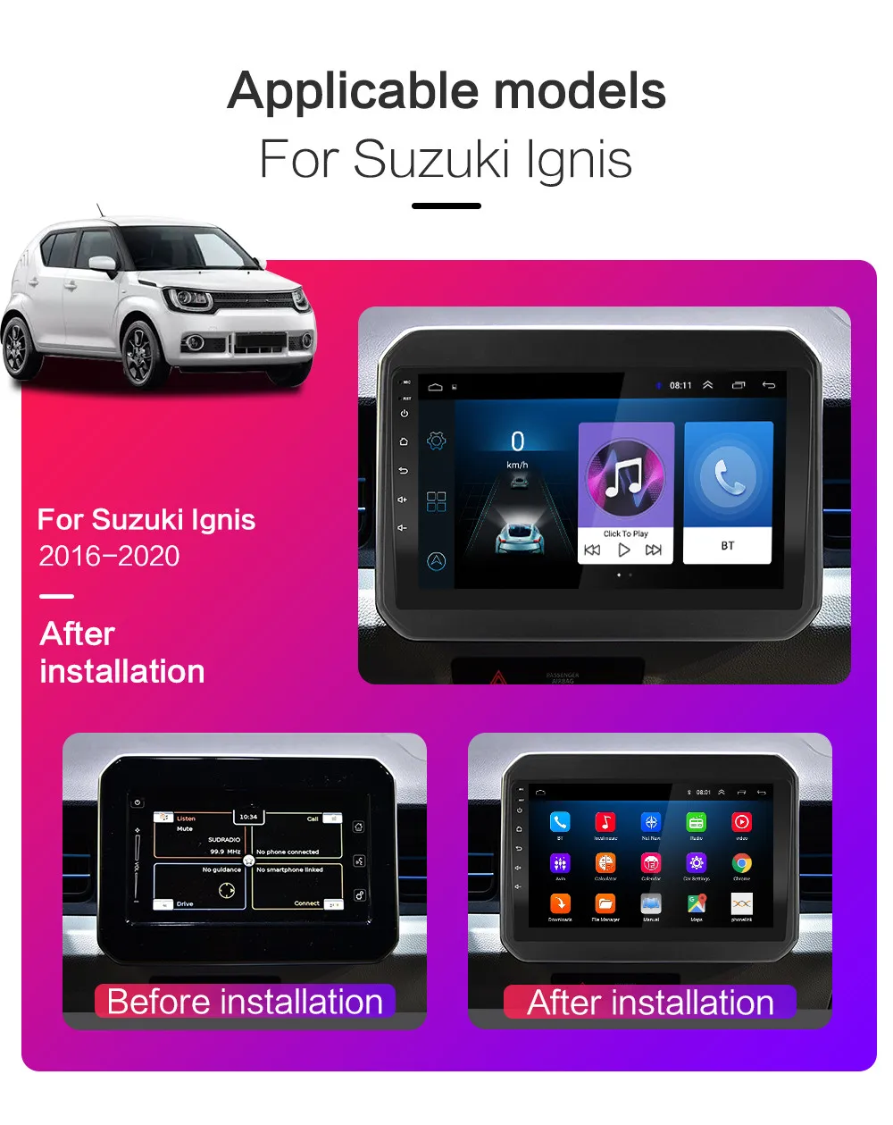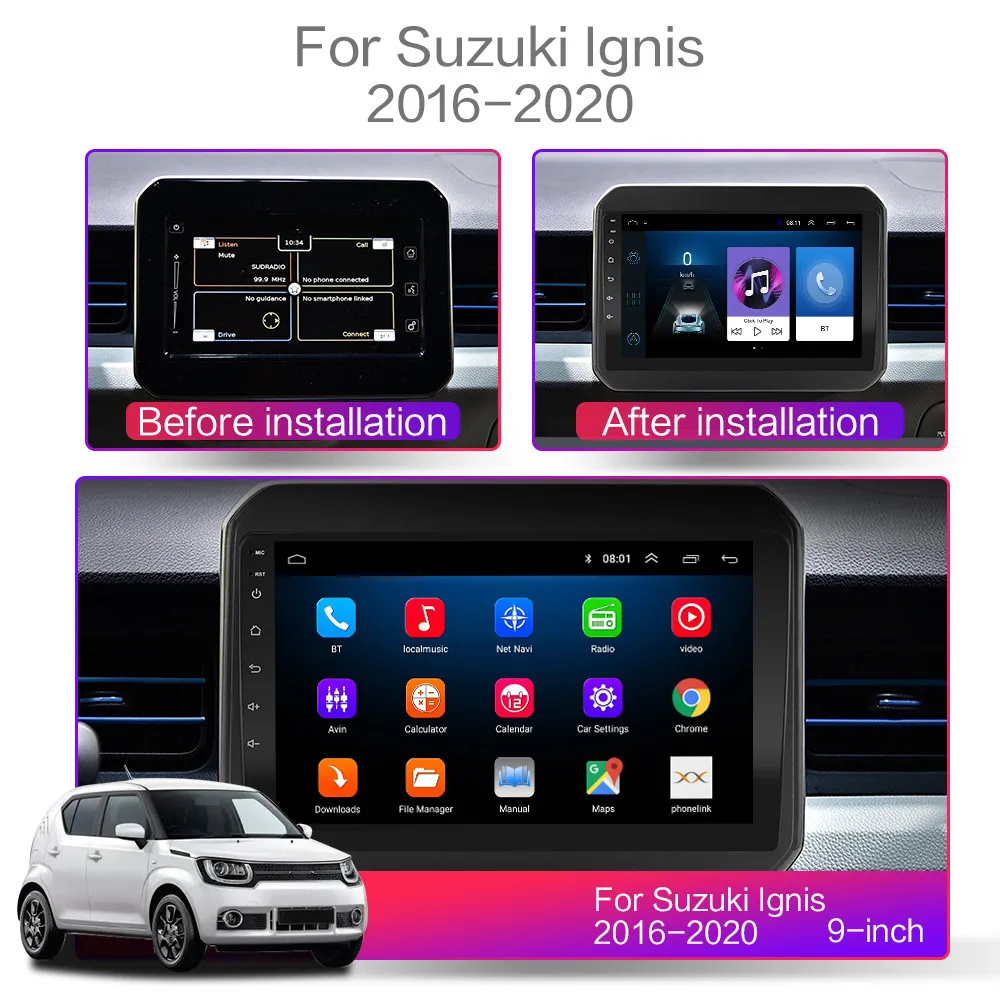 Для Suzuki Ignis 2016 2017 2018 2019 20201, 4-ядерная конфигурация включает (RAM + ROM): 1G + 16G / 2G + 16G / 2G + 32G / 4G-SIM-3560-2G + 32G [опционально];2, 8-ядерная конфигурация включает (RAM + ROM): 7260L-2G + 32G / 7260L-4G + 64G / 4G-SIM-5760-2G + 32G / 4G-SIM-5760-4G + 64G / 4G-SIM-TS10-4G + 32G / 4G-SIM-TS10-6G + 128G [опционально];3, 4-ядерный содержит: версию: Android 8,1;Четырехъядерный процессор MTK8227 / Cortex-A7Поддержка логотипа автомобиля 5; Заводской пароль: 8888Разрешение: HD 2.5D,1024*600;Не поддерживает функцию AM, RDS;Обыпосылка пакет версии Wi-Fi поддерживает функцию вывода видео;Версия 3560-4G-SIM-WiFi: Android 8,1; Поддерживает DSP; Не поддерживает функцию вывода видео;4, 8-ядерный содержит версию: Android 9,0 или Android 10;Восемь ядер: CPU Quad core и GPU Quad core соответственно;Поддержка логотипа автомобиля 5; Пароль завода: 8888; Разрешение: HD 2.5D,1024*600;Версия 7260L-WIFI: поддерживает функции DSP, разделения экрана; Не поддерживает выход видео;Версия 4G-SIM-5760-WIFI и 4G-SIM-TS10-WIFI: поддерживает функции DSP , IPS , Carplay, разделения экрана; Не поддерживает видеовыход;5. Операционная система Android может установить приложение Google Play store Skype Facebook youTube Twitter и т. д.;6. Поддержка: радиостанции, звонков по Bluetooth, музыки по Bluetooth, управления рулевым колесом, встроенного Wi-Fi, MP3, видео-музыки (MPG, AVI), навигации, видеовыхода, зеркальной связи, USB 4G LTE Wi-Fi ключ и другие функции;