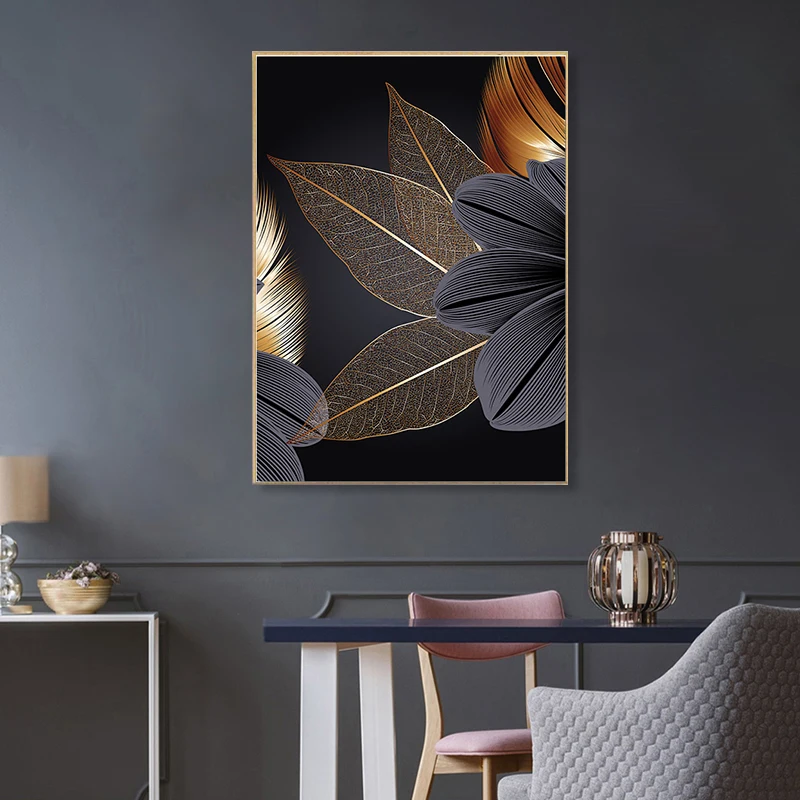 Постер на холсте, с изображением листьев черного золота, абстрактное искусство, современный светильник в скандинавском стиле