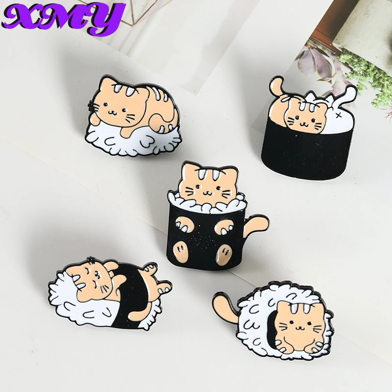 Эмалированные булавки в виде кота, суши, Рисового шара, милые животные на заказ, Японская еда, брошь на лацкан, значок для сумки, мультяшное ювелирное изделие, подарок для друга