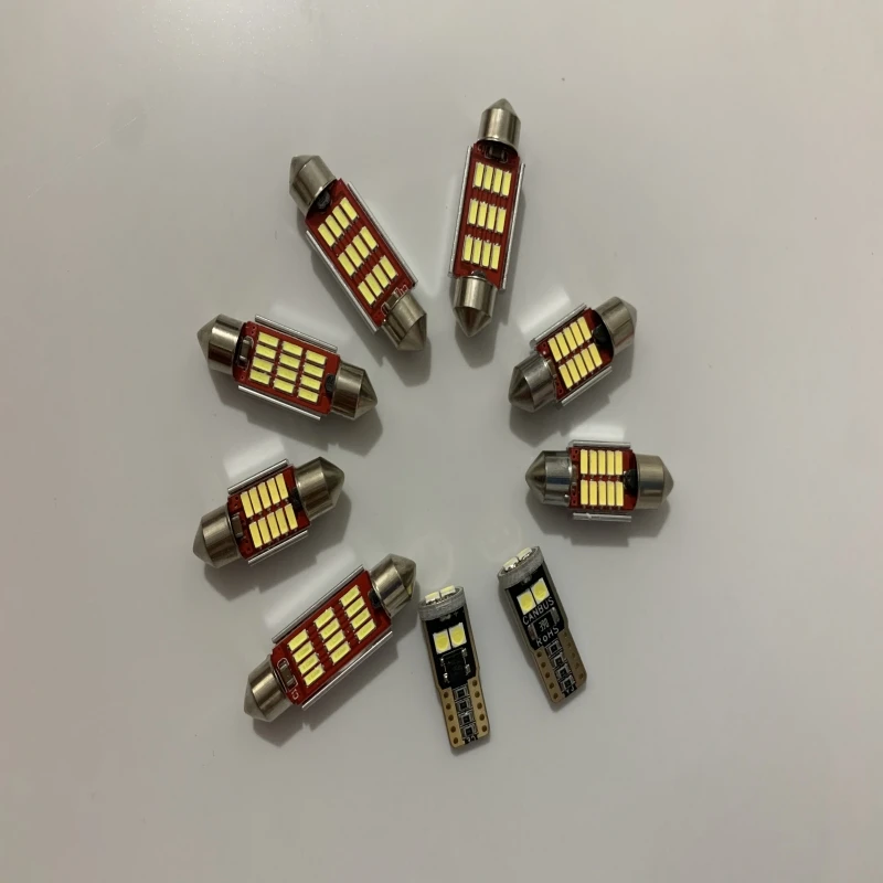 Посылка включает:Светильник карты (2 шт.)Купольный светильник (2 шт.)Туалетный зеркальный светильник (2 шт.)Светильник багажника (1 шт.)Дверной светильник (2 шт.)Светильник номерного знака (2 шт.)Запасной светильник (2 шт.)