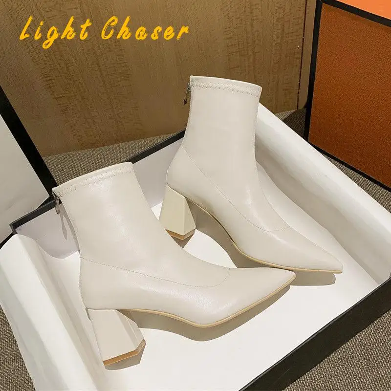 Модные белые короткие сапоги на высоком каблуке, женские осенне-зимние женские сапоги с острым носком, новинка 2021, чеширские сапоги, женские сапоги на высоком каблуке