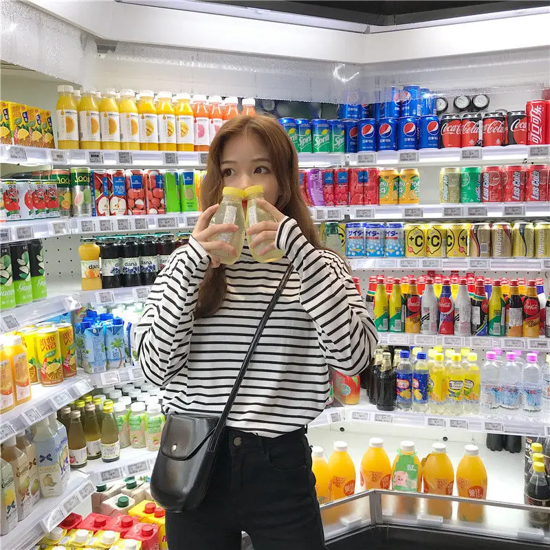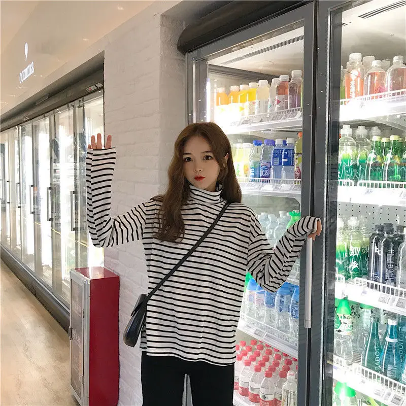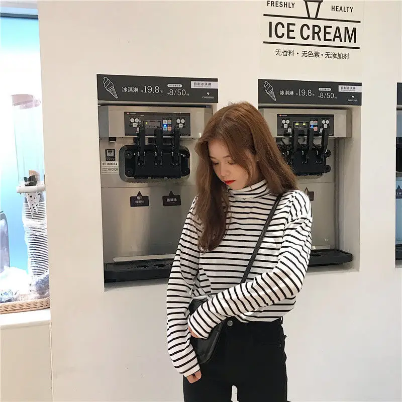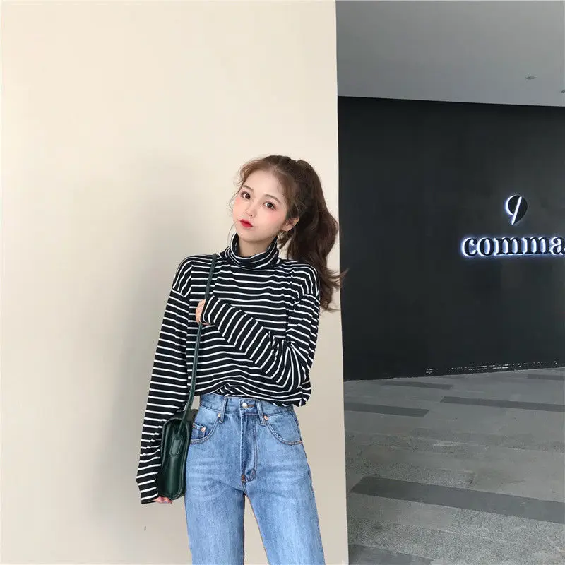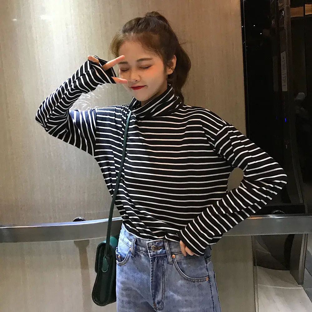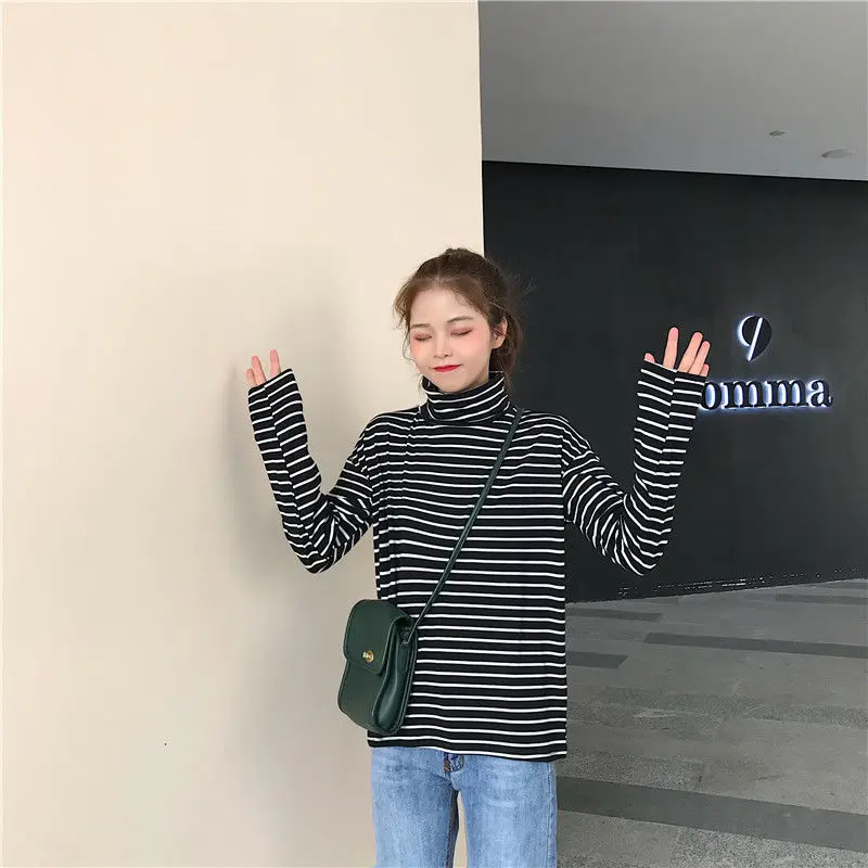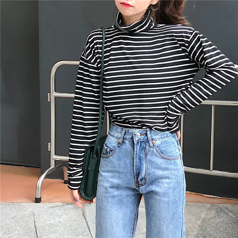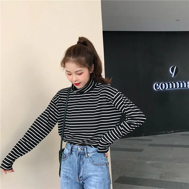 Женская винтажная водолазка, в полоску, универсальная Повседневная футболка для женщин, элегантное облегающее боди в Корейском стиле Харадзюку