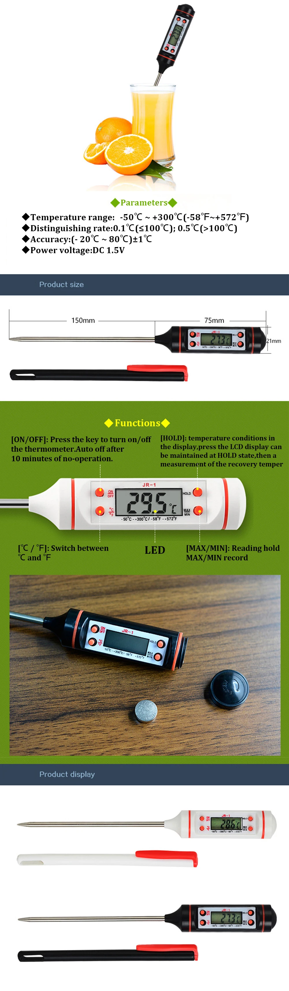 Температура измерения: от-50 ℃ ~ + 300 ℃ (-58 ℉ ~ + 572 ℉) Температура Точность: ± 1 ℃/℉ Мощность питания: 1,5 V(AG13) x 1 Кнопка ВКЛ/ВЫКЛ, клавиша ℃/℉, клавиша удержания, Макс/мин Цвет ключа: черный Материал: АБС + 304 нержавеющая сталь посылка содержимое: 1 * цифровой термометр 1 * крышка зонда