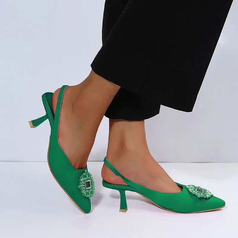 Женские туфли на каблуке-шпильке, зеленые туфли с острым носком и ремешком на пятке, профессиональная обувь для девушек, 2021