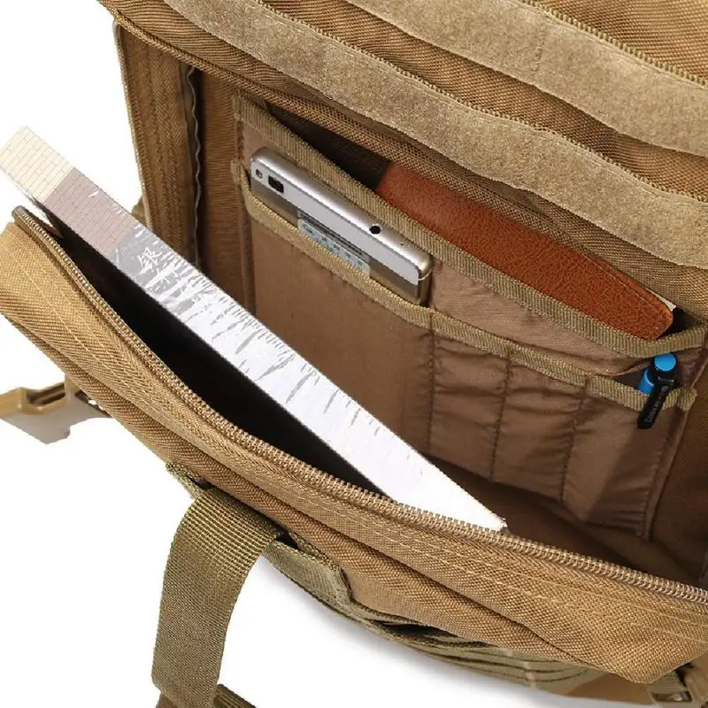Тактический рюкзак имеет систему MOLLE. MOLLE немного отличается от большинства тактических рюкзаков и не соответствует спецификации. Расстояние между моллами менее 1/2 дюйма. Спереди и по бокам рюкзака были добавлены крепежные точки Molle, чтобы добавить сумки для аксессуаров и легко прикрепить дополнительные тактические сумки или снаряжение,