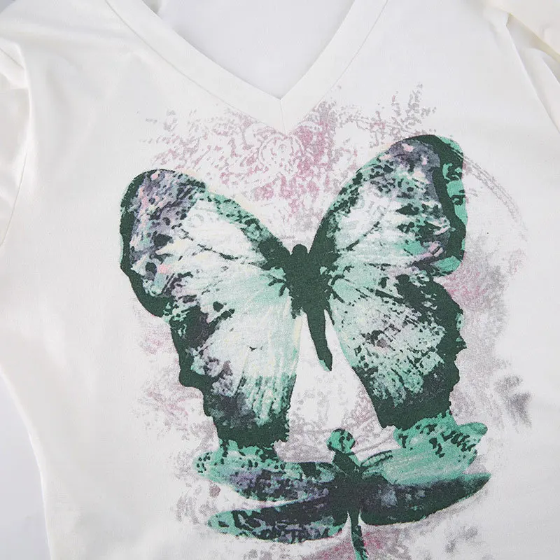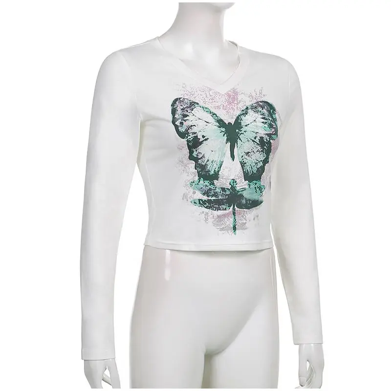 Женские топы с длинным рукавом и V-образным вырезом, женские укороченные топы с принтом бабочки, модные женские футболки в Корейском стиле, уличная одежда, осень 2021