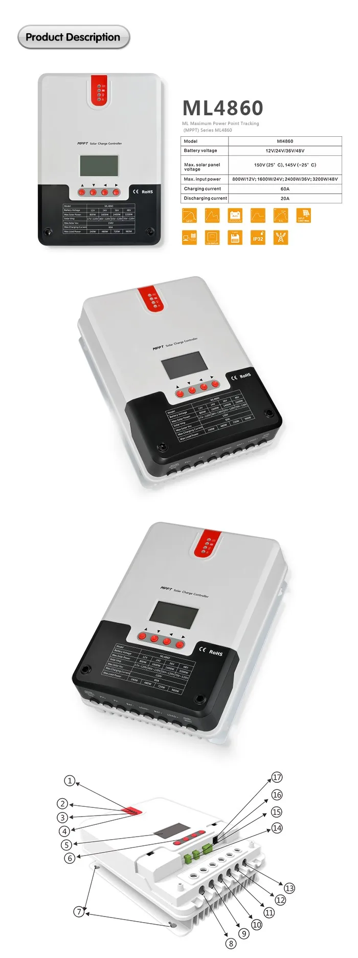60A 12В 24В 36В 48В солнечная панель MPPT Контроллер заряда солнечных батарей ЖК-дисплей ML4860 зарядное устройство RV