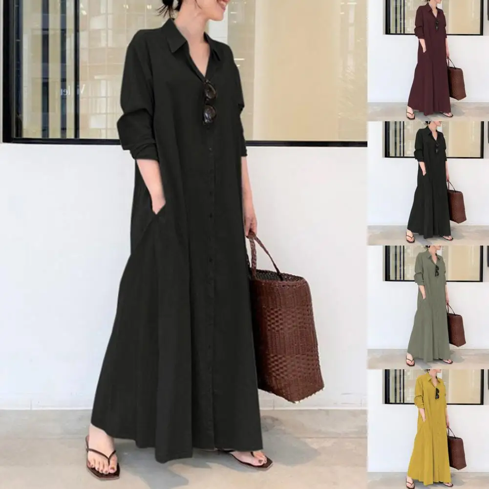 Женское длинное однобортное платье, повседневное однотонное платье с длинным рукавом, отложным воротником и широким подолом, уличная одежда для осени