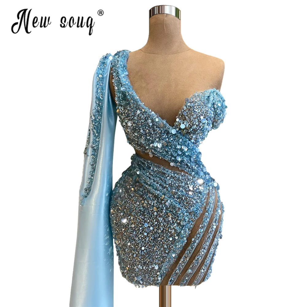 Платье-Русалка с бисером, с блестками, небесно-голубого цвета, для выпускного вечера, с глубоким V-образным вырезом, с одним длинным рукавом, коктейльное платье
