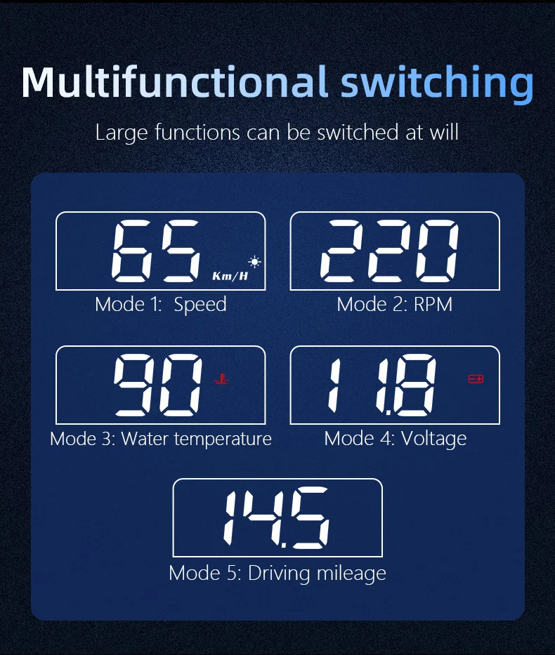 1. Автомобиль WiiYii 100% гарантия бренда2. Отображение данных более блестит и четко: 6 различных режимов отображения3. Безопасное вождение, держите глаза впереди, не нужно опускать голову, чтобы увидеть приборную панель во время вождения4. Легко установить, нужно только подключить HUD с автомобильным OBD портом с помощью OBD кабеля, HUD будет отображаться, когда автомобильный двигатель ВКЛ/ВЫКЛ5. Чрезмерная сигнализация вождения, Сигнализация низкого напряжения, сверхскоростная сигнализация, высокотемпературная сигнализация, неисправная сигнализация двигателя6. KMH и MPH переключатель свободно.7. Совместимость для: автомобилей в стандарте OBD II (после 2007 года)8. Место установки: на центральной консоли9. Подключение: подключение к автомобильному порту OBD10. Информация о дисплее: скорость, двигатель об/мин, температура воды, расстояние вождения, напряжение батареи, давление турбины/давление впуска, неисправный код