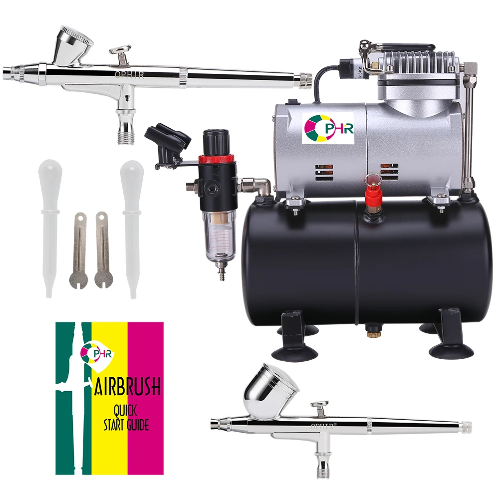 1x одноцилиндровый поршневой компрессор с воздушным баком2x Аэрограф Комплект1x1,8 м шланг для подачи воздуха1x воздушный фильтр1x Мини-держатель аэрограф3x руководство