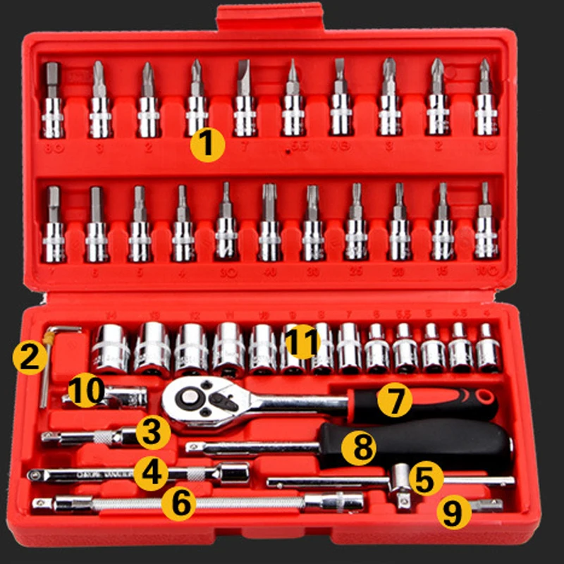 Набор торцевых ключей, комплект из 46 предметов, с храповым механизмом, для ремонта дома