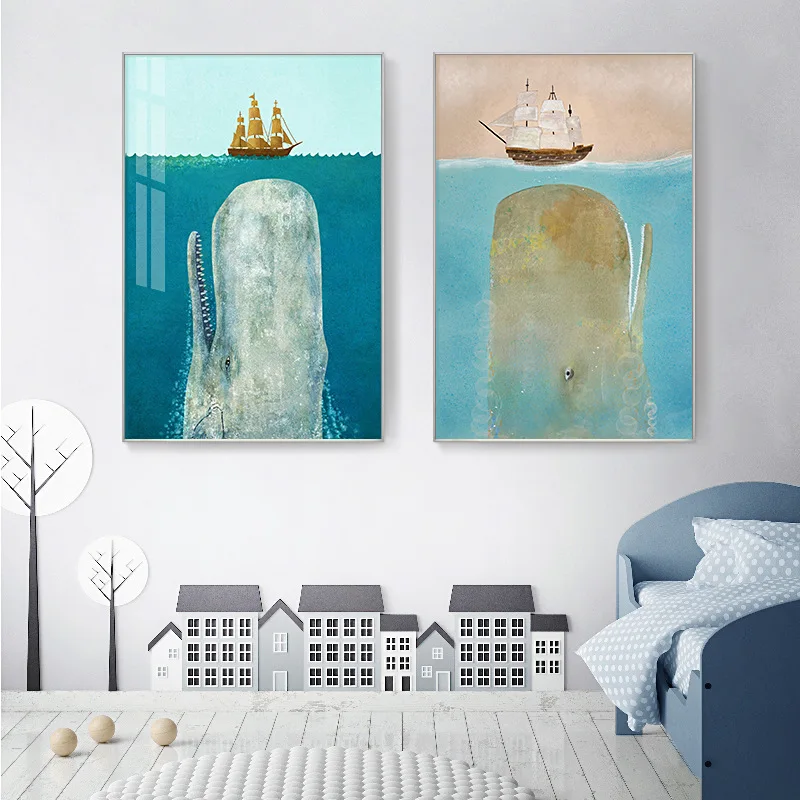 Постеры с изображением морских животных синих акварелей, скандинавский корабль Кита, морской холст, картина и принты, Настенная картина, декор для детской комнаты