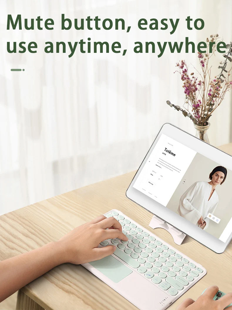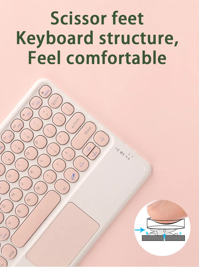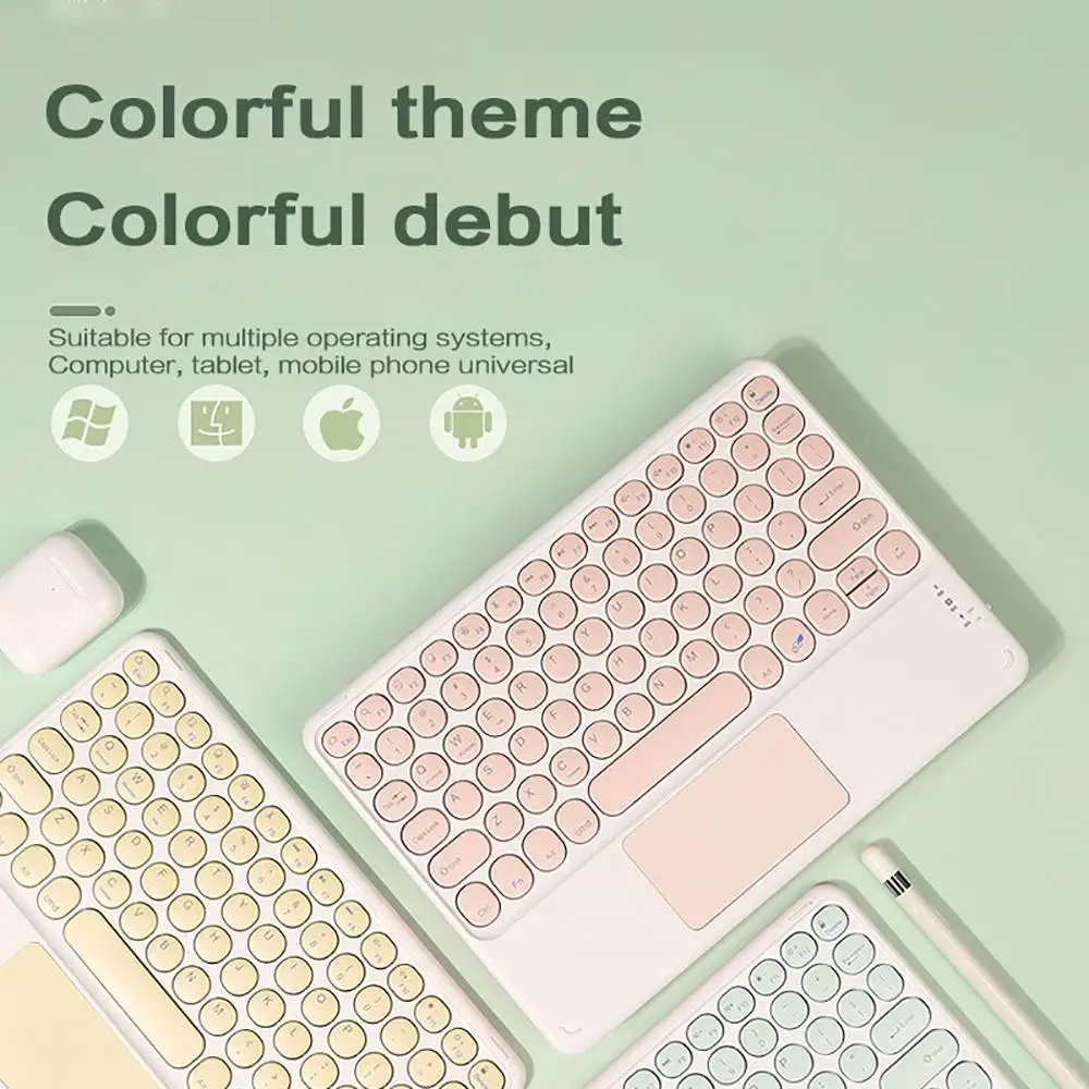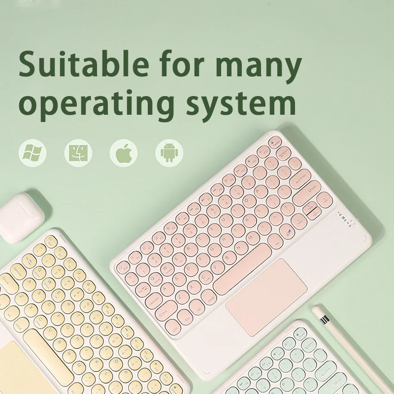 Прокладка:Цвет: розовый/желтый/зеленый/белый/черныйСпособ подключения: Bluetooth-compita 5,0Мощность: перезаряжаемаяХарактеристики: с тачпадомОсобенности продукта:1. Широкая совместимость:Используется со всеми четырьмя основными операционными системами, поддерживающими Bluetooth (iOS, Android, Mac OS и Windows) , совместим с iPad, iPhone и планшетами с поддержкой Bluetooth, ноутбуками и мобильными телефонами, такие как iPad air , iPad mini, iPad Pro, IPhone Xs Max и т. д. (устройства без Bluetooth должны покупать bluetooth-приемник самостоятельно)2. Ультратонкий, легкий и портативный:Эта легкая bluetooth-клавиатура предназначена для тех, кому нужна портативная клавиатура, способная работать или играть, и особенно подходит для деловых поездок.3. Перезаряжаемый и автоматический режим сна:Универсальная беспроводная bluetooth-клавиатура использует встроенный литиевый аккумулятор, его можно легко заряжать через usb-кабель, не нужно менять аккумулятор. Встроенная перезаряжаемая батарея невероятно долговечна, время работы в режиме ожидания составляет около 6 месяцев между зарядами. Беспроводная клавиатура bluetooth может автоматически войти в режим сна для экономии энергии.4. Стабильное соединение:Передовая технология Bluetooth обеспечивает соединение без кабеля с рабочим диапазоном 10 метров. Но для настольного ПК-ноутбука без функции bluetooth, вам необходимо вставить сторонний вечерние bluetooth-адаптер (не входит в комплект) для установки драйвера bluetooth перед использованием.5. Удобный и тихий ввод текста:Бесшумные низкопрофильные клавиши обеспечивают совершенно новый уровень комфорта на кончиках ваших пальцев. Кроме того, храните все ваши наиболее часто используемые функции и средства массовой информации ближе, чем когда-либо, выделенные Windows горячие клавиши.Быстрое соединение BluetoothКлавиатура Bluetooth подключается к iPad, ей нужно 4 шага, чтобы открыть новую эру офиса:1. Нажмите кнопку, и светильник питания включен;2. Нажмите кнопку подключения (Fn + C), светильник bluetooth включен;3. Откройте iPad bluetooth и выберите «bluetooth-клавиатуру»;4. После первого подключения, он будет автоматически подключаться к вашему iPad, когда в следующий раз вы начнете использовать клавиатуру.