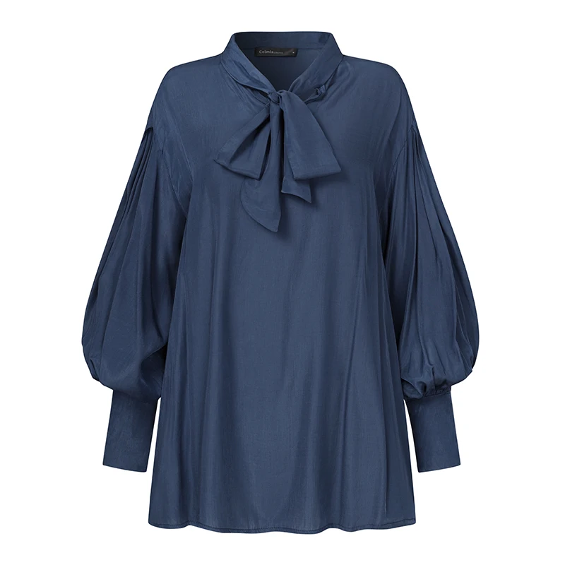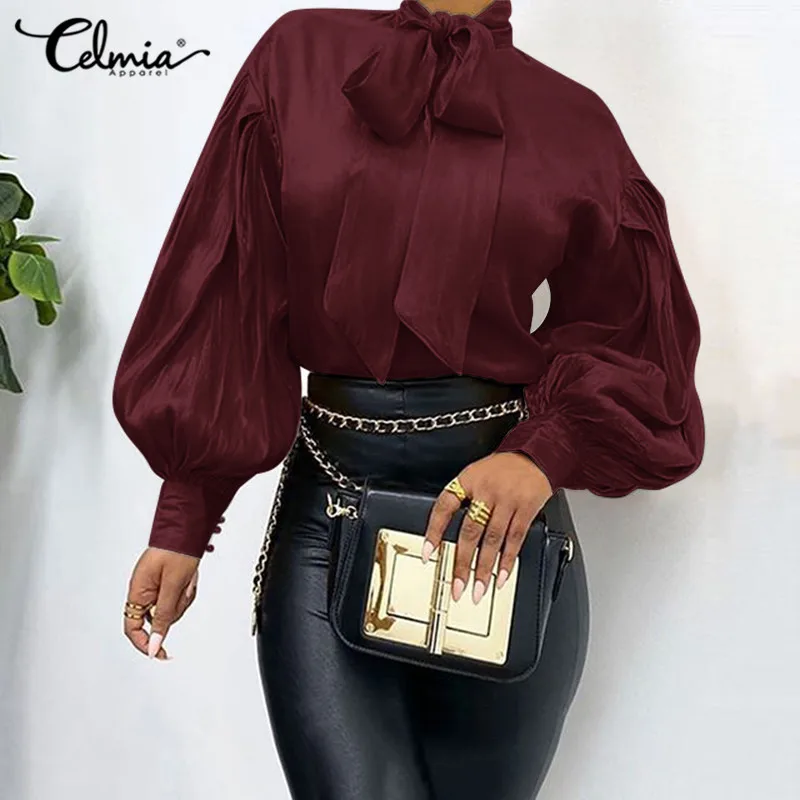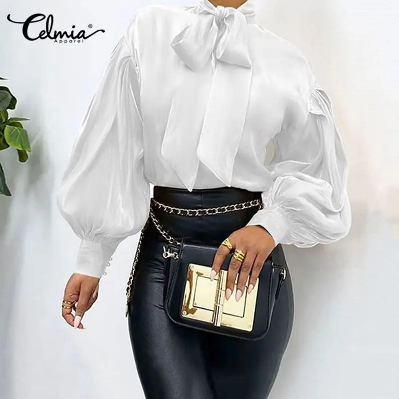 Элегантные офисные женские рубашки Celmia с бантом на воротнике и длинными рукавами-фонариками, женские офисные блузки 2022, модная однотонная свободная туника, топ, Блузы для вечерние