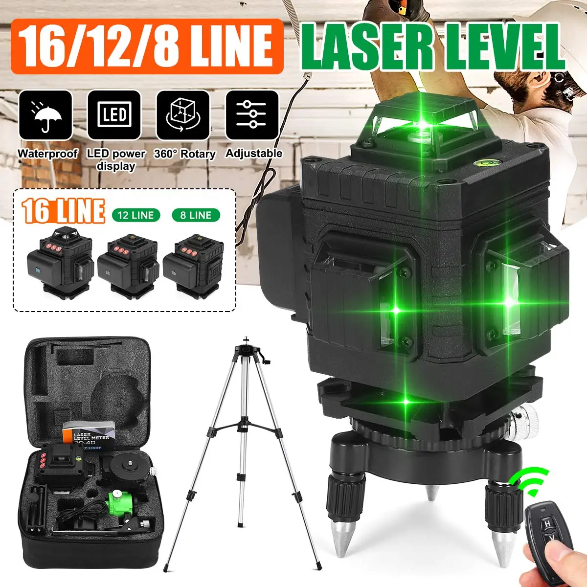 16/12/8 линия 360 ° Горизонтальный Вертикальный крест 4D зеленый светильник лазерный уровень самонивелирующийся супер мощный лазерный луч