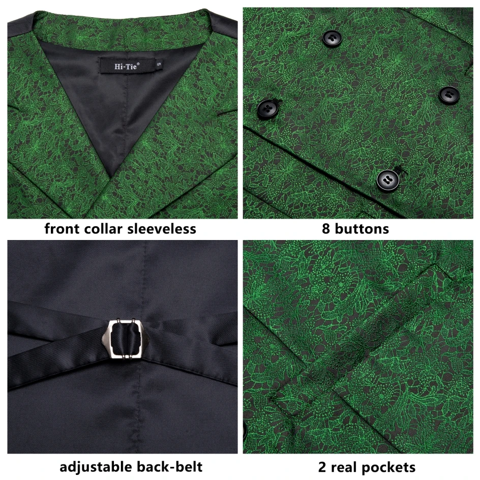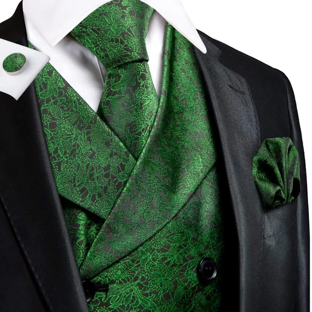 Hi-Tie Зеленый однотонный Цветочный Пейсли Шелковый мужской тонкий жилет галстук набор для костюма платье свадебное 4 шт. жилет галстук носовой Запонки Набор