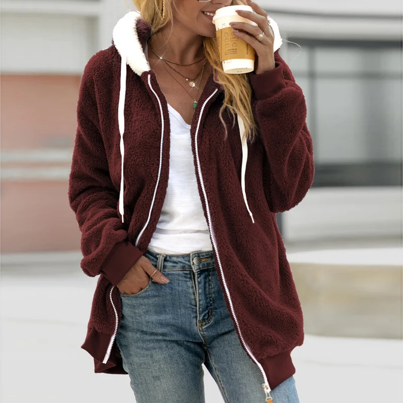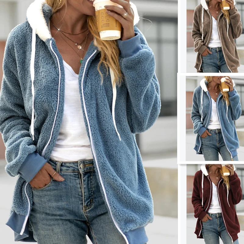 Элегантная Женская толстовка на молнии с кулиской, Модные свободные теплые куртки, плюшевое мягкое пальто с капюшоном на осень и зиму, кардиган, женское платье