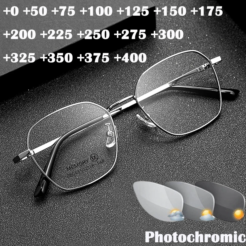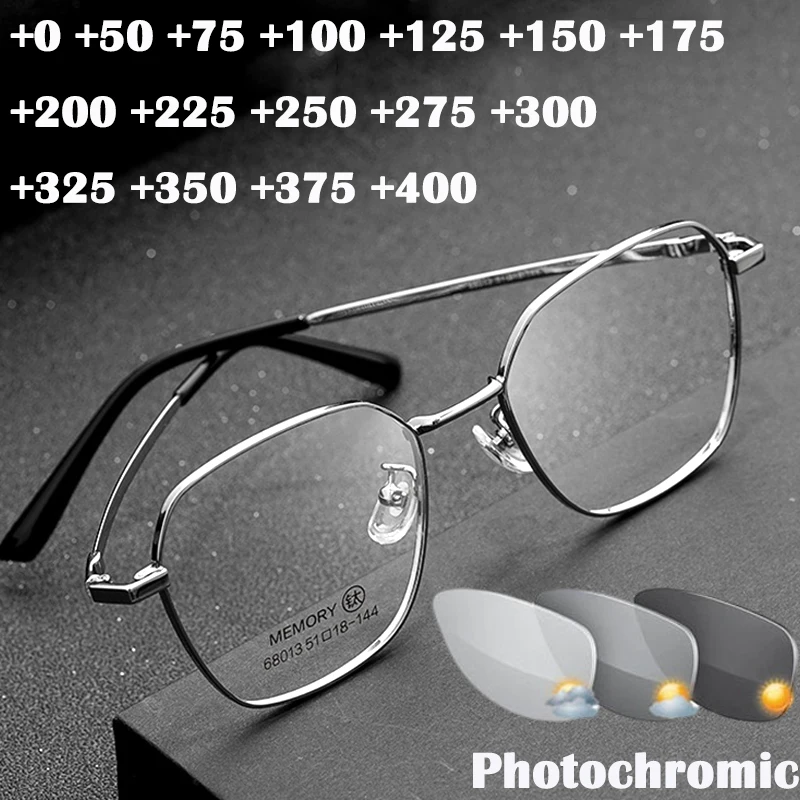 Очки для чтения ультралегкие многоугольные, фотохромные, титановые, для мужчин и женщин + 125