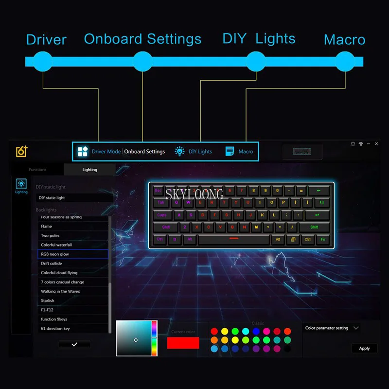 1. Светильник DIY2. Мощные игровые макросы3. Есть сотни эффектов на светильник, доступных для загрузки (непрерывное обновление)4. Программируемый полный ключ